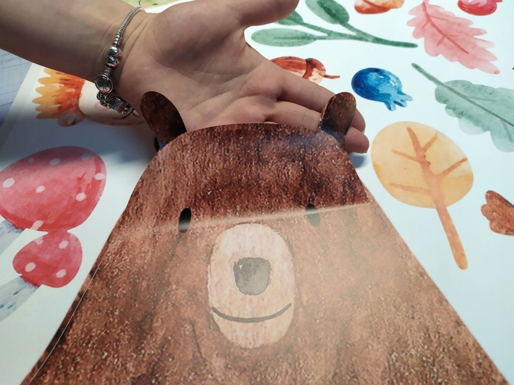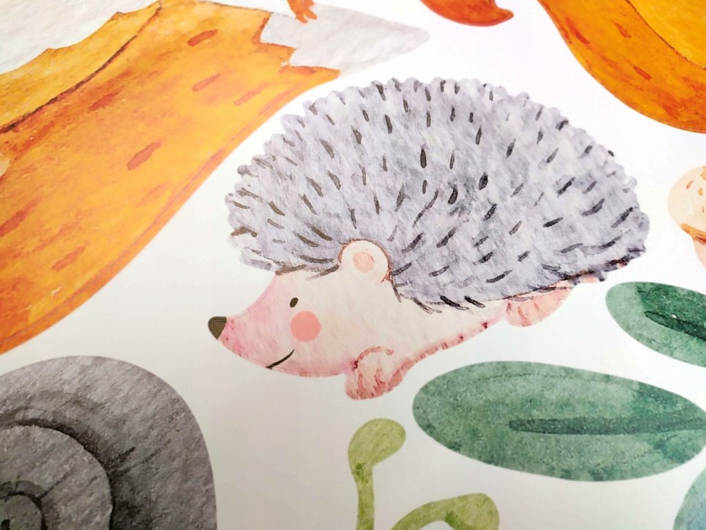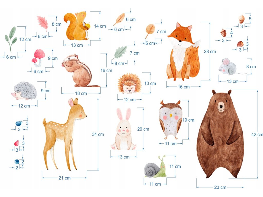 W skład zestawu wchodzą naklejki przedstawiające zwierzęta leśne, min. niedźwiedzia, lisa, sarenkę, wiewiórkę itd. oraz elementy dodatkowe, czyli liście, jagody, żołędzie, grzyby... Są one wydrukowane na matowej folii samoprzylepnej. Poszczególne elementy na arkuszu są wycięte i stanowią osobne naklejki - gotowe do naklejenia. Rozmiary przedstawione są na zdjęciu poniżej.