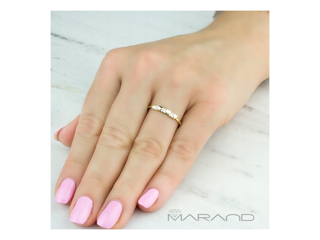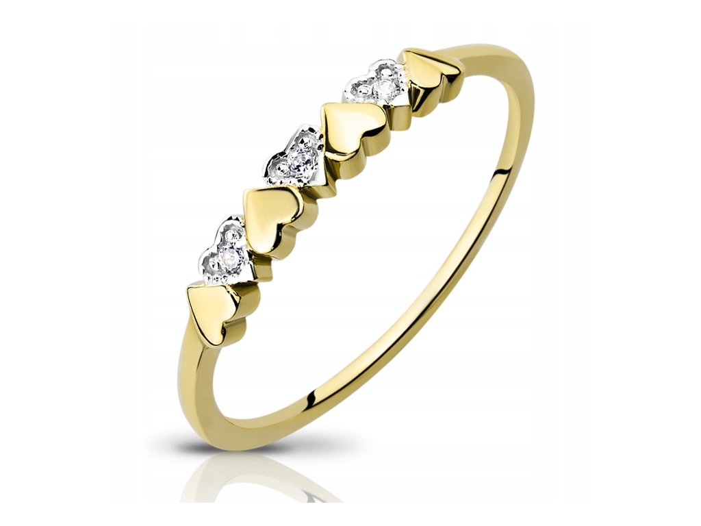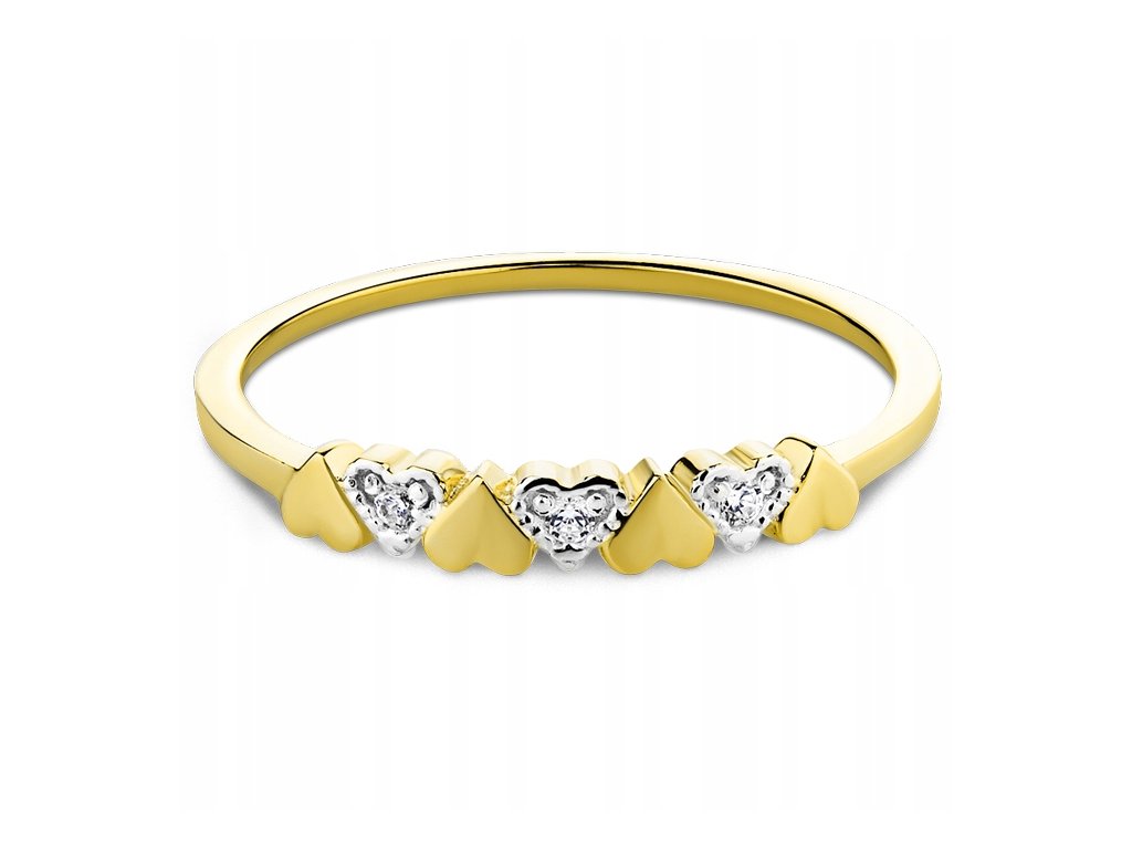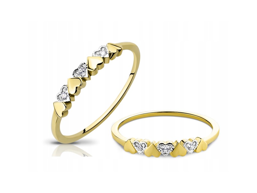Elegancki, subtelny i nowoczesny złoty pierścionek w niezwykle ciekawej formie obrączki udekorowanej połączonymi sercami. Co drugie serce wysadzane jest lśniącymi cyrkoniami.
