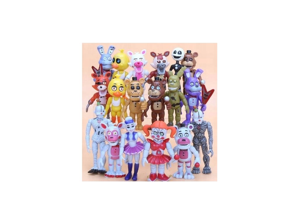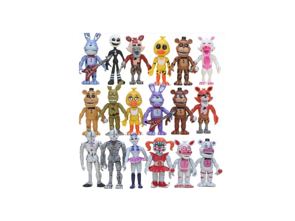 Zestaw 18 figurek z najpopularniejszego horroru dla młodzieży Five Nights at Freddy's. Figurki są ręcznie malowane, co powoduje, że wyglądają jak żywe. Figurki mają odczepiane elementy, ręce i głowa poruszają się. To idealny prezent dla każdego fana i miłośnika Five Nights at Freddy's.
