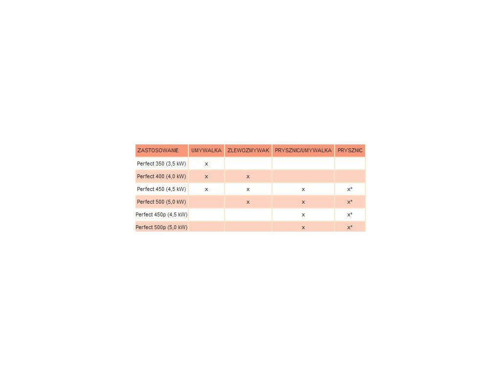 Vďaka všetkým týmto vlastnostiam sú ohrievače tejto série ... zariadenia na úsporu energie. Použitá konštrukcia vykurovacieho telesa úplne chráni zariadenie pred jeho upchatím v dôsledku usadenín vodného kameňa vyzrážaného dokonca aj z veľmi tvrdej vody. Ohrievače Perfect 350, 400, 450, 500 používajú snímač prietoku s jazýčkovým jazýčkom a spínač s elektronickým prúdom s neporovnateľne dlhšou životnosťou ako mechanické prúdové spínače (napríklad relé). To umožnilo eliminovať nespoľahlivé mechanické časti používané v tradičných ohrievačoch. Ďalej sa použil elektronický senzor prevzdušňovania vyhrievacieho prvku, ktorý navyše minimalizoval možnosť poškodenia vyhrievacieho prvku v dôsledku periodického nedostatku vody. Vďaka vyššie uvedeným riešeniam bolo možné vytvoriť najmenší prietokový ohrievač vody na trhu pri zachovaní veľmi vysokej účinnosti ohrevu.
