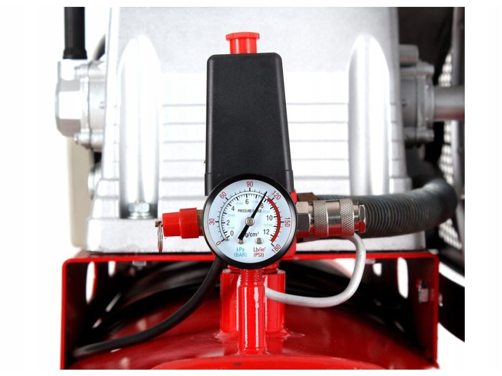 W wyposażaniu bez dodatkowej opłaty znajdują się manometry, dzięki którym widać aktualne ciśnienie powietrza w butli kompresora.