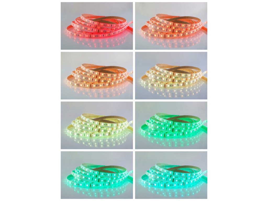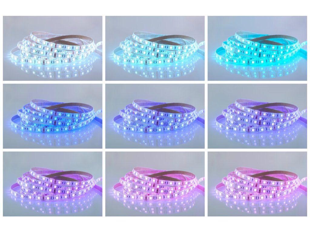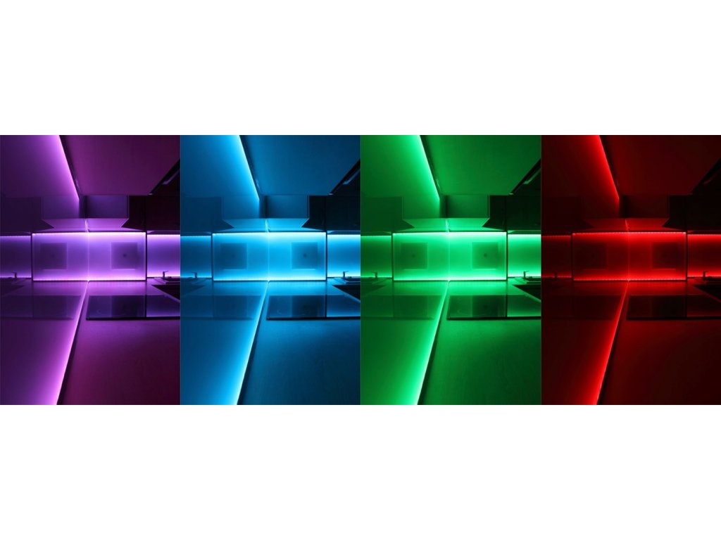 • Multikolor - LED kolorowy może świecić każdą barwą - czerwonym, niebieskim, zielonym,mieszanką tych barw oraz białym zimnym. Kolor biały w taśmach RGB uzyskujemy mieszając barwę czerwoną zieloną i niebieską wciskając na pilocie przycisk W lub biały.