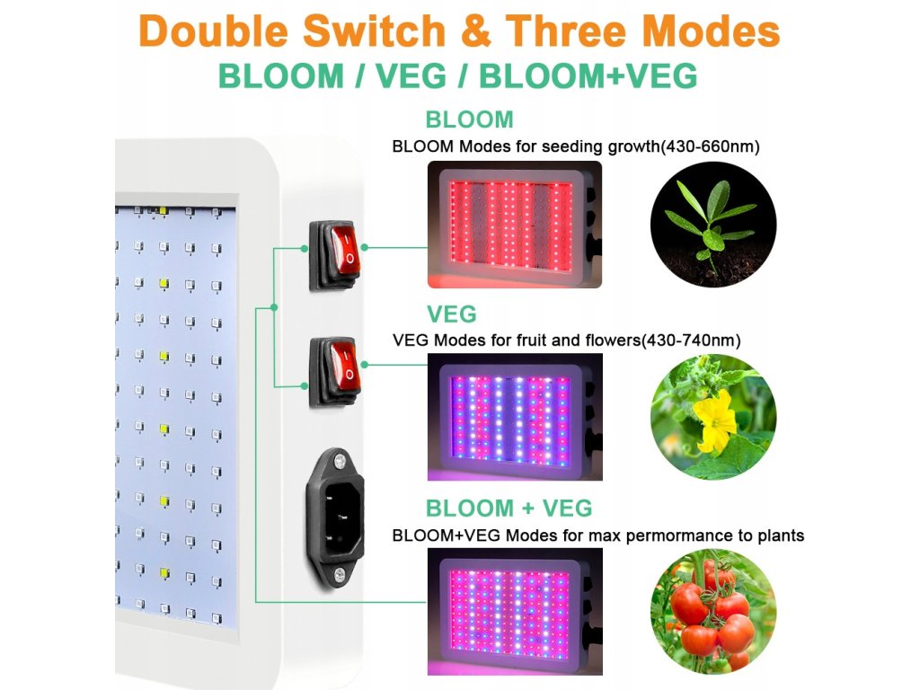 * FULL SPECTRUM 312 / 216LEDs MODEL Z PODWÓJNYM KANAŁEM VEG & BLOOM: Kanał VEG wykorzystuje pełne spektrum kolorów dla kiełkujących sadzonek i młodych roślin. Kanał BLOOM wykorzystuje więcej czerwonych fal, aby symulować późne lato i jest najbardziej odpowiedni dla roślin w fazie kwitnienia. VEG i BLOOM mogą być używane razem, aby pobudzić maksymalną wydajność wzrostu od sadzonki do zbioru. To światło może zastąpić tradycyjną lampę HPS / MH o mocy 1200W, zużywając łącznie tylko 80W!