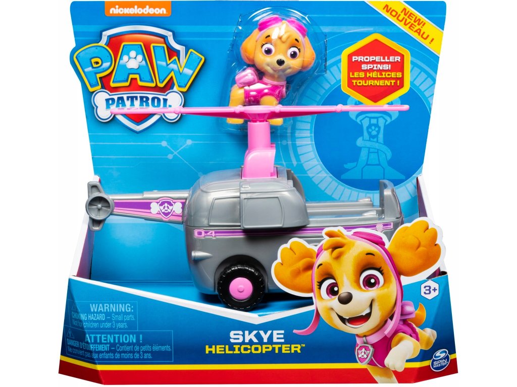 W skład zestawu wchodzi helikopter oraz figurka przedstawiająca pieska Skye. Figurka jest wierną kopią filmowego bohatera, ubrana jest w różowy kubraczek i plecak, na głowie ma różową pilotkę z goglami. Figurka posiada ruchomą głowęHelikopter jest w kolorze metalicznym szarym z różowo-fioletowymi elementami. Posiada trzy ruchome kółka, dzięki którym bez problemu może poruszać się po powierzchniach płaskich, oraz obrotowe śmigło. Figurkę Skye można umieścić w kokpicie helikoptera, dzięki czemu staje się jego pilotem.