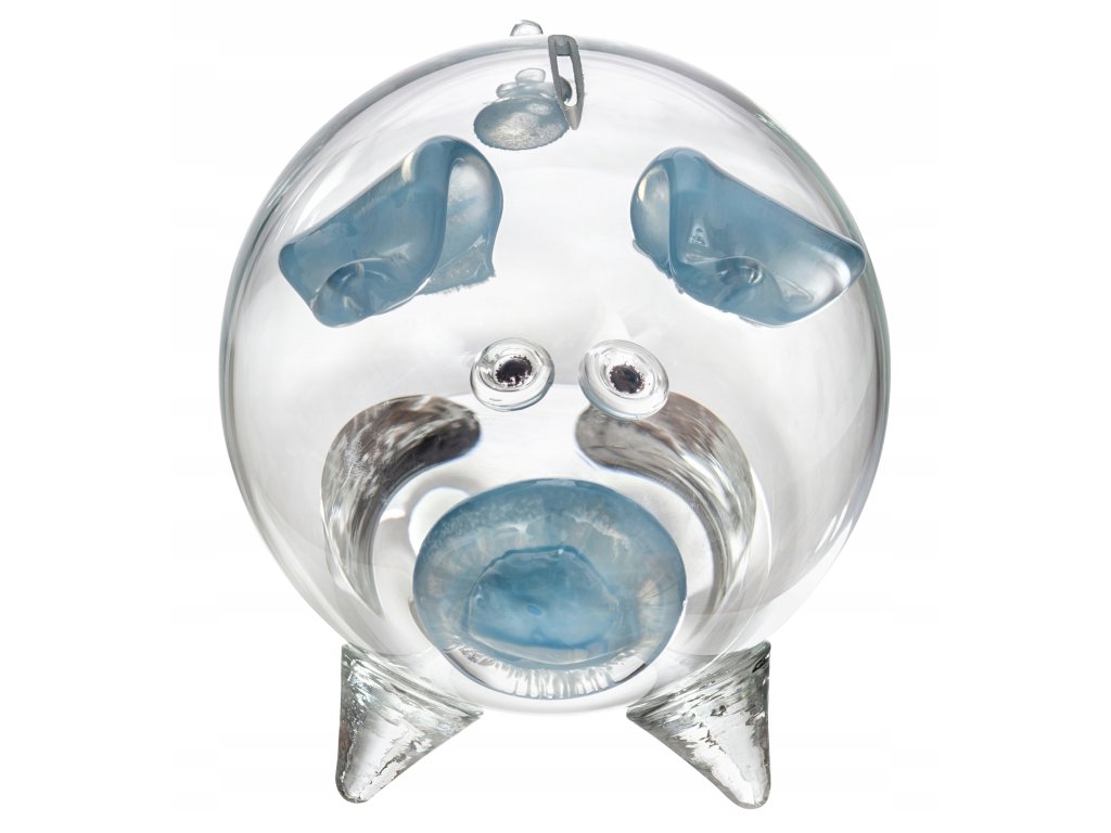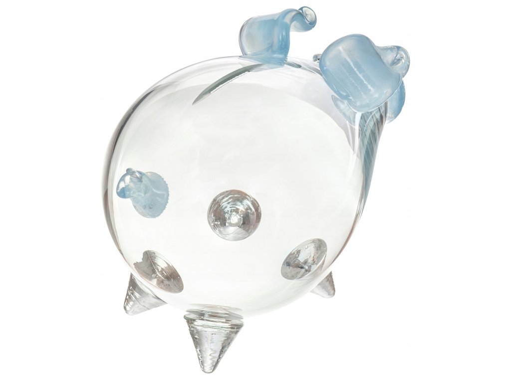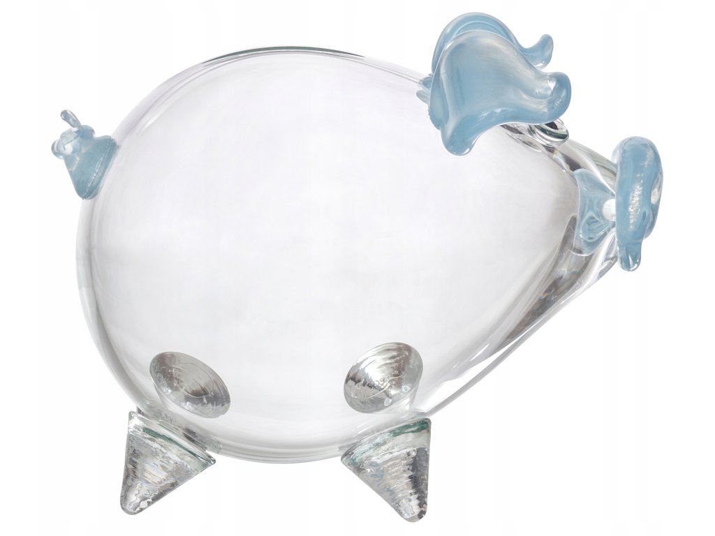 Świnka wykonana jest ze szkła bezbarwnego a jej ryjek, uszy i ogonek wykonane są ze szkła w kolorze niebieskim jak na zdjęciach.