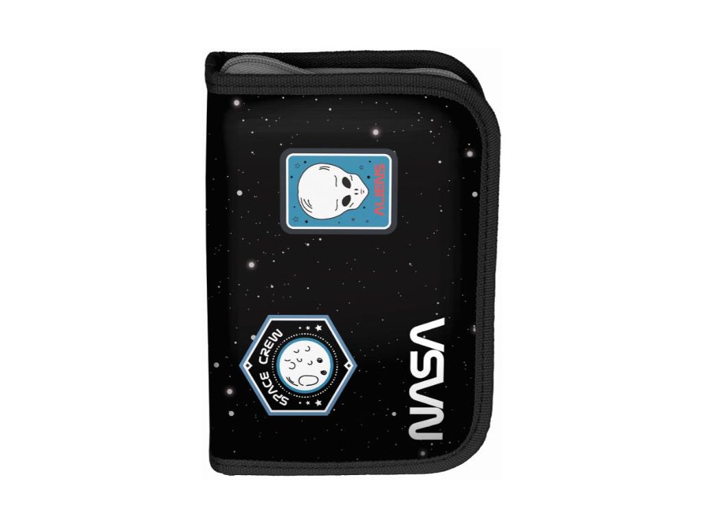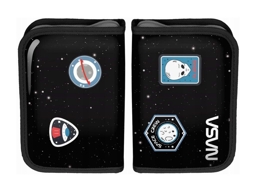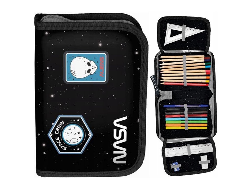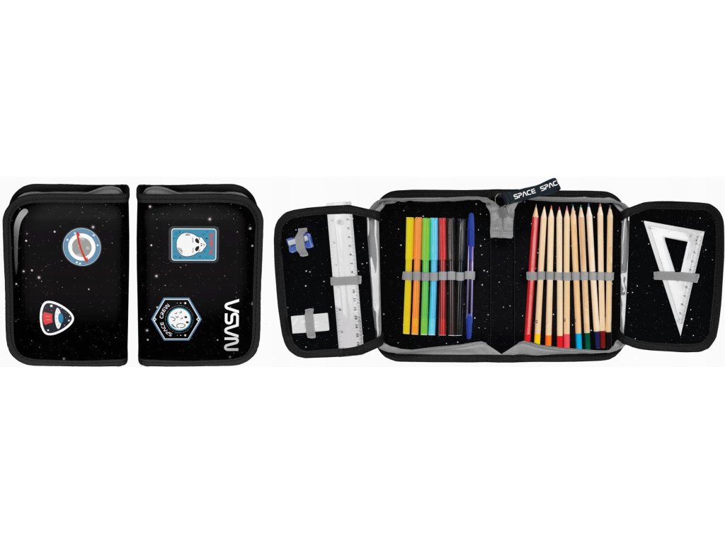 Piórnik z wyposażeniem NASA czarny. Piórnik jednokomorowy posiada zadrukowane, kolorowe wnętrze oraz zaopatrzony jest w dwie klapy z wyposażeniem.