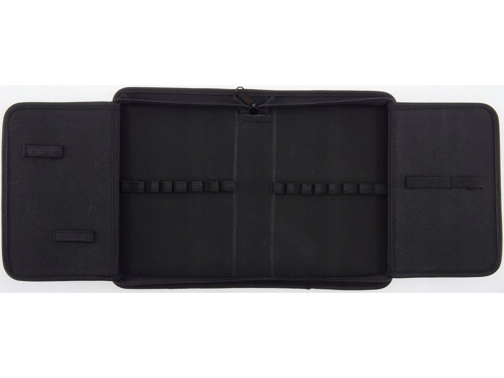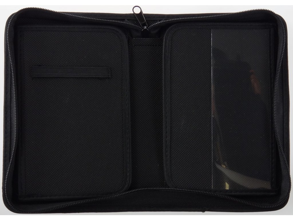 Piórnik z rozkładanymi klapami, zapinany za pomocą zamka błyskawicznego.