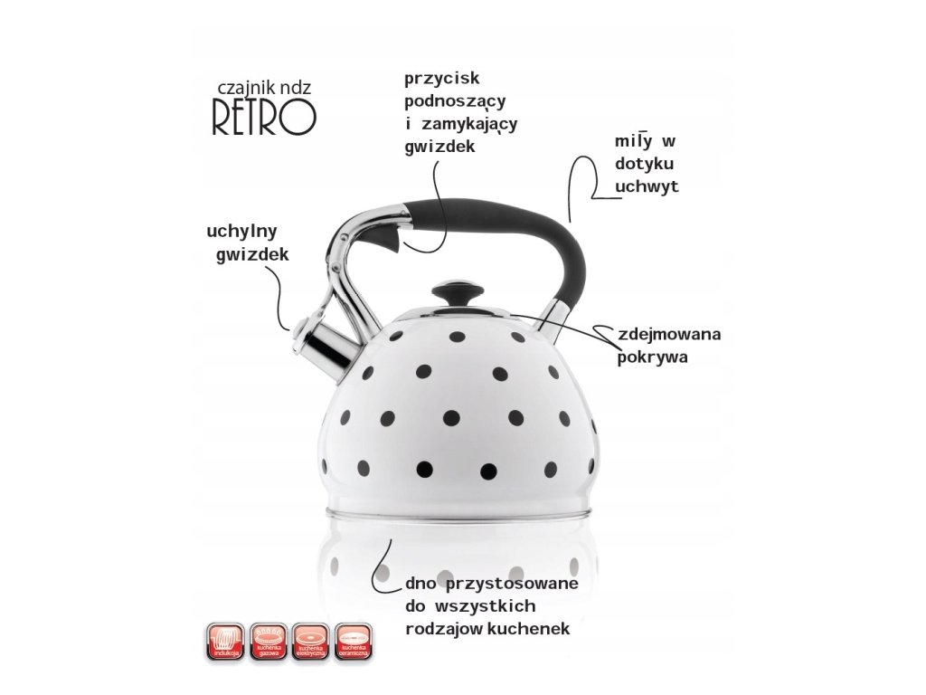 Naczynie umożliwia zagotowanie wody na kuchence gazowej, elektrycznej, ceramicznej i indukcyjnej.