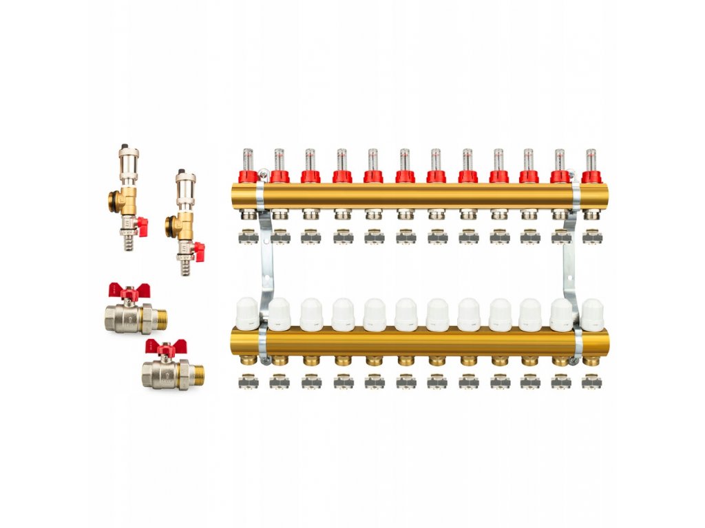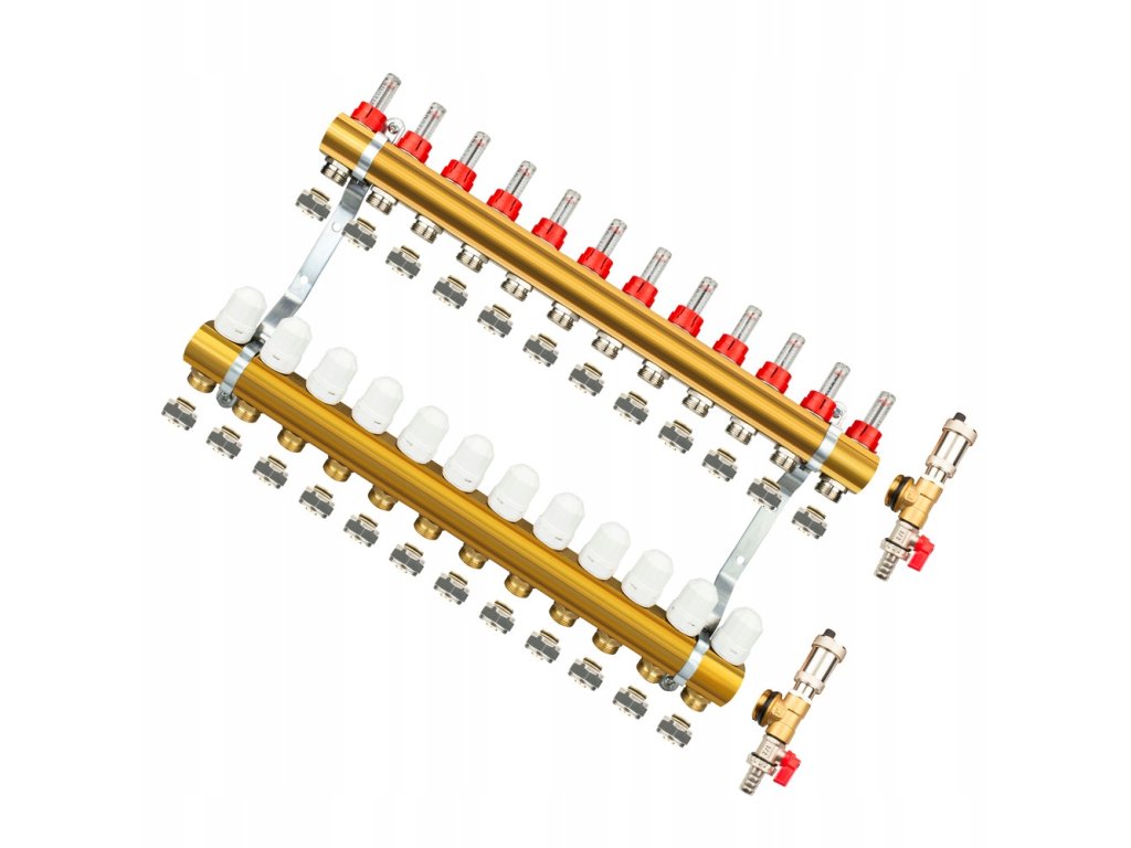 Rozdzielacz CO mosiężne do podłogówki - uzbrojony (adaptery PEX, odpowietrzniki automatyczne, trójniki, zawory spustowe) 12 obwodów