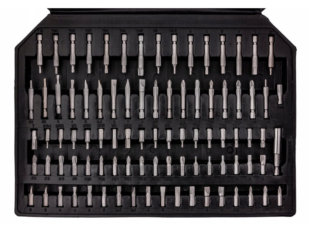 Kufor má tiež šiesty podnos, ktorý obsahuje rôzne typy skrutkovacích hrotov.