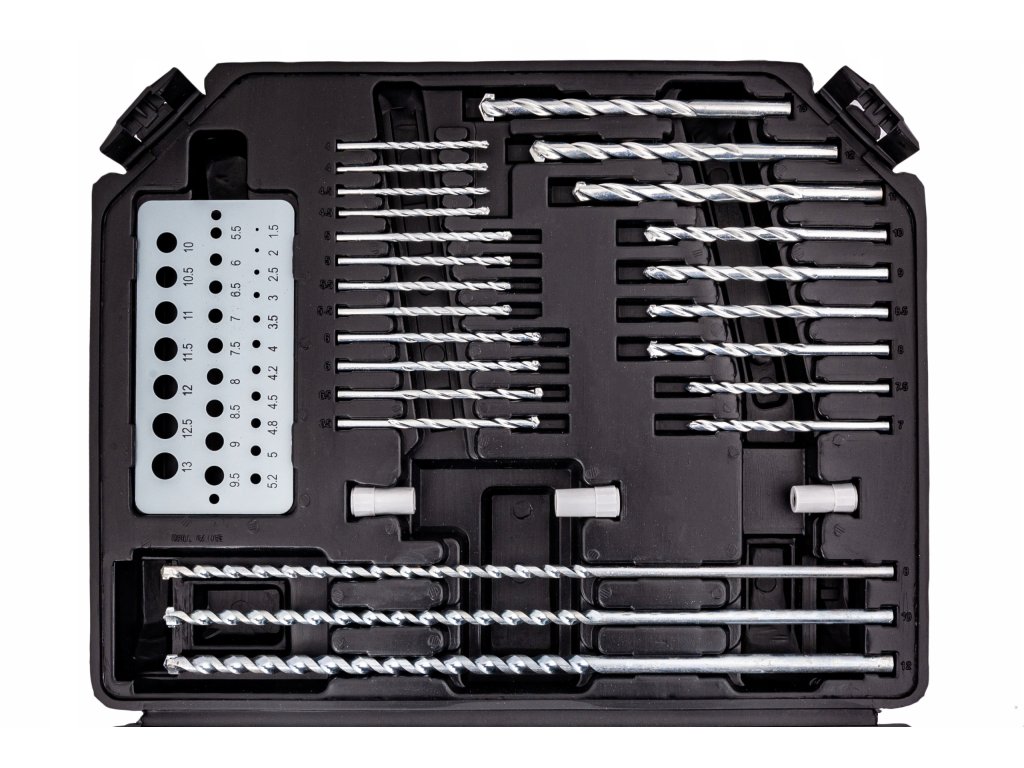 Vo funkčnom kufri nájdete 5 súprav vrtákov do betónu, kovu a dreva, vrátane dierových píl ....