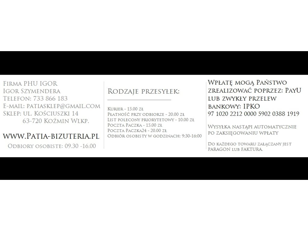 Sklep PATIA oferuje biżuterię złotą w próbach 333, 585 oraz srebrną 925. W naszych kolekcjach występują zarówno tradycyjne i klasyczne wyroby jak i najnowsze trendy występujące w jubilerstwie. Staramy się ciągle rozwijać i poszerzać asortyment oraz przy każdym zamówieniu robimy wszystko by zadowolić klienta. Wyroby znajdujące się u nas w ofercie wykonany są z niezwykłą starannością. Mamy nadzieję że każdy znajdzie u nas coś wyjątkowego dla siebie.