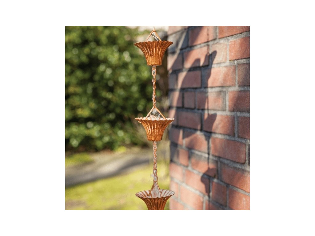 Oryginalna alternatywa dla tradycyjnej rury spustowej. Ozdobny łańcuch deszczowy z kubeczkami przypominającymi kwiaty tulipana daje unikalną ozdobę dla domu. Segmenty łańcuchowe łączą żłobkowane kubki ze sobą, woda łagodnie spływa w dół. Łańcuch deszczowy wystarczy za pomocą haczyka (dołączony w zestawie) zawiesić w otworze rynny. Długość wynosi 2,54m, ale w razie konieczności można dowolnie przedłużać lub skracać deszczownicę. Można umieścić zbiornik lub donicę tak, aby zebraną wodę używać w ogrodzie.
