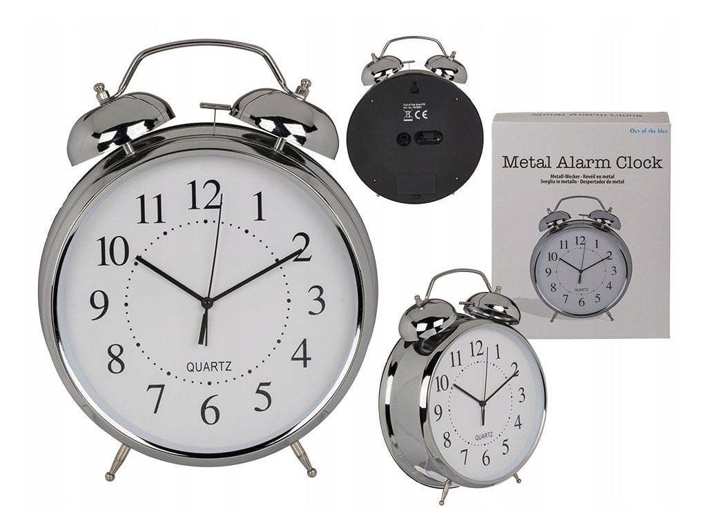 Metalowy srebrny budzik w stylu retro. Jego wskazówki świecą w ciemności. Bardzo stylowy gadżet dla każdego śpiocha. Budzik w rozmiarze XXL.