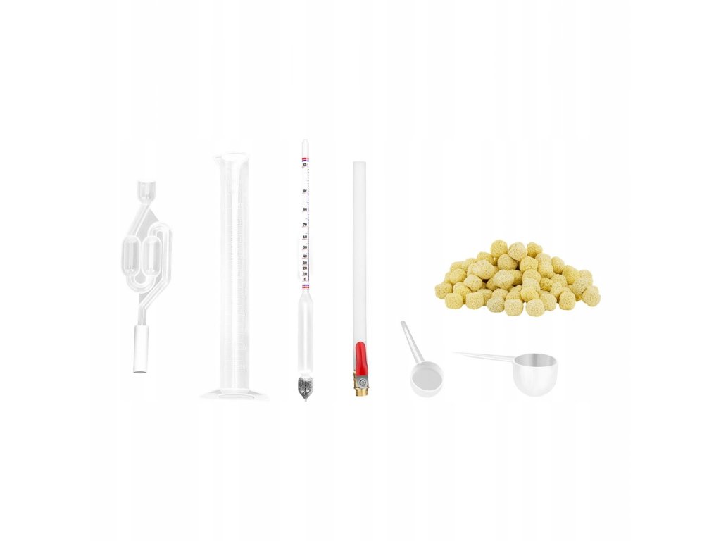 Komplet niezbędnych akcesoriów: 2-metrowy gumowy wąż do wody, łyżeczka pomiarowa, menzurka 100 ml, szmatka parowa do filtracji, woreczek ceramicznych pierścieni do pochłaniania pary wodnej w kolumnie wstępnego chłodzenia, profesjonalny przyrząd pomiarowy