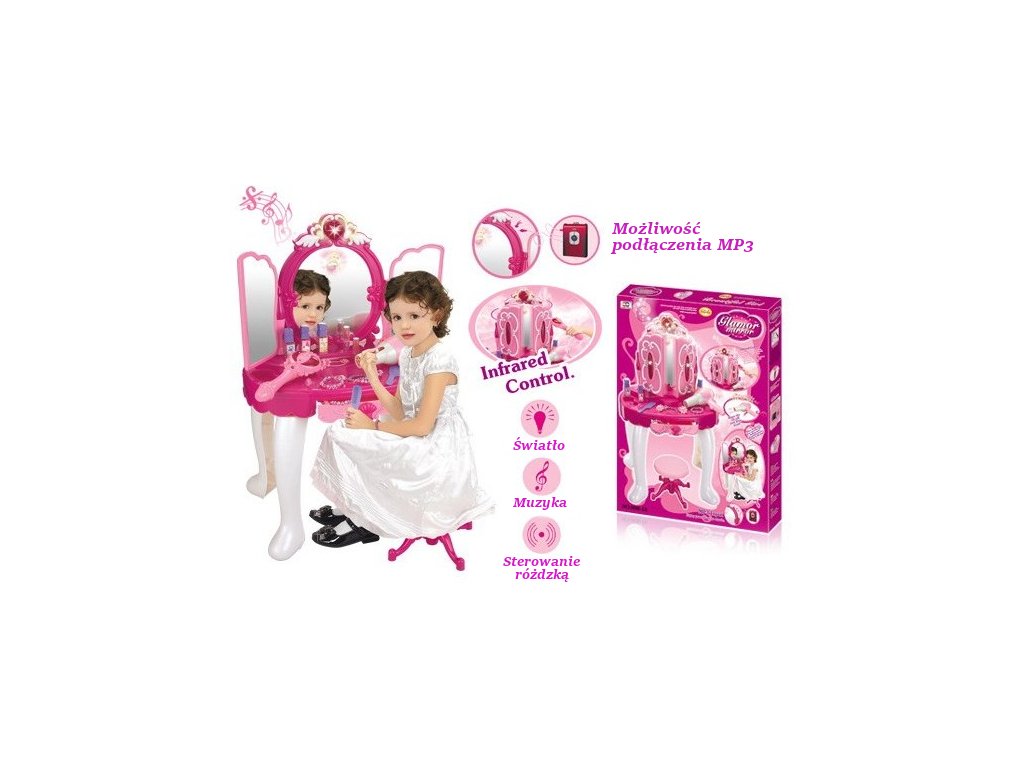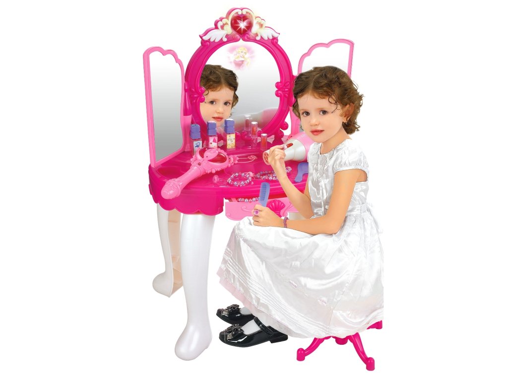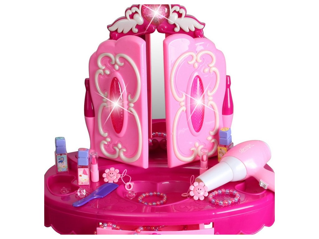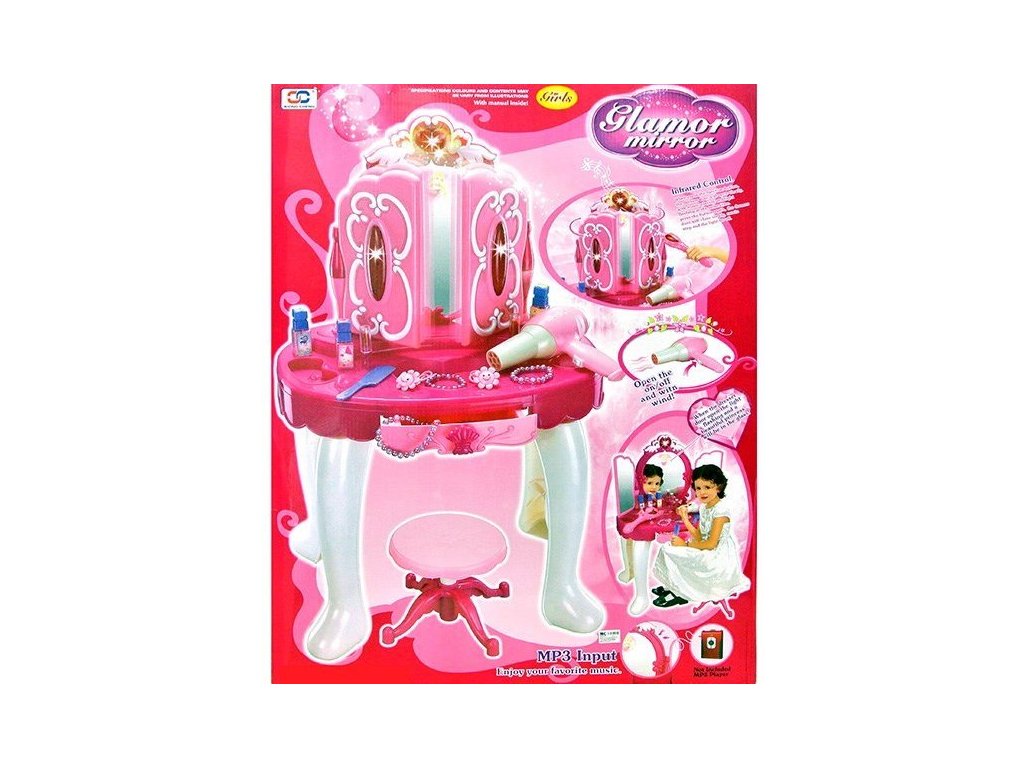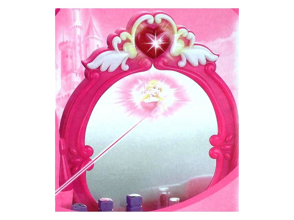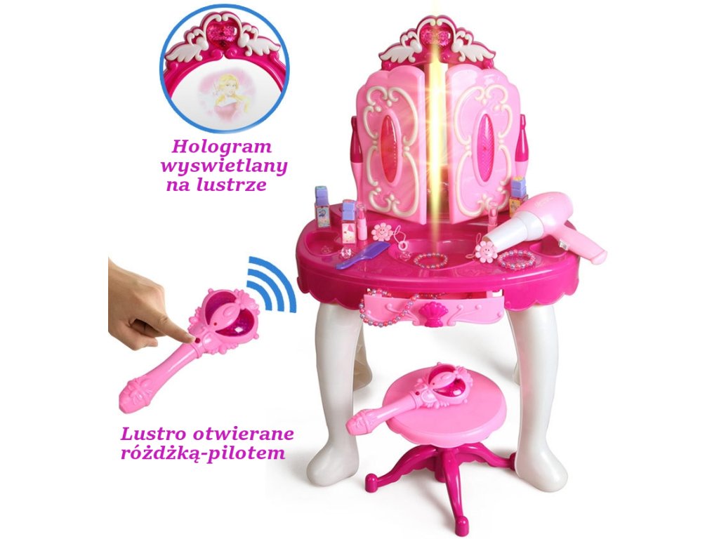 Różowa toaletka z automatycznie otwieranym lustrem za pomocą dołączonej różdżki, z dźwiękami, światełkami i możliwością podłączenia muzyki z MP3. Podczas otwierania na lusterku wyświetla się hologram z księżniczką. Lustra wykonane są z bezpiecznego nie zbijalnego materiału. Toaletkę wyposażono w otwieraną szufladę gdzie dziewczynka może przechowywać różne skarby. Załączono także krzesełko, dmuchającą suszarkę a także liczne akcesoria do makijażu i stylizacji.