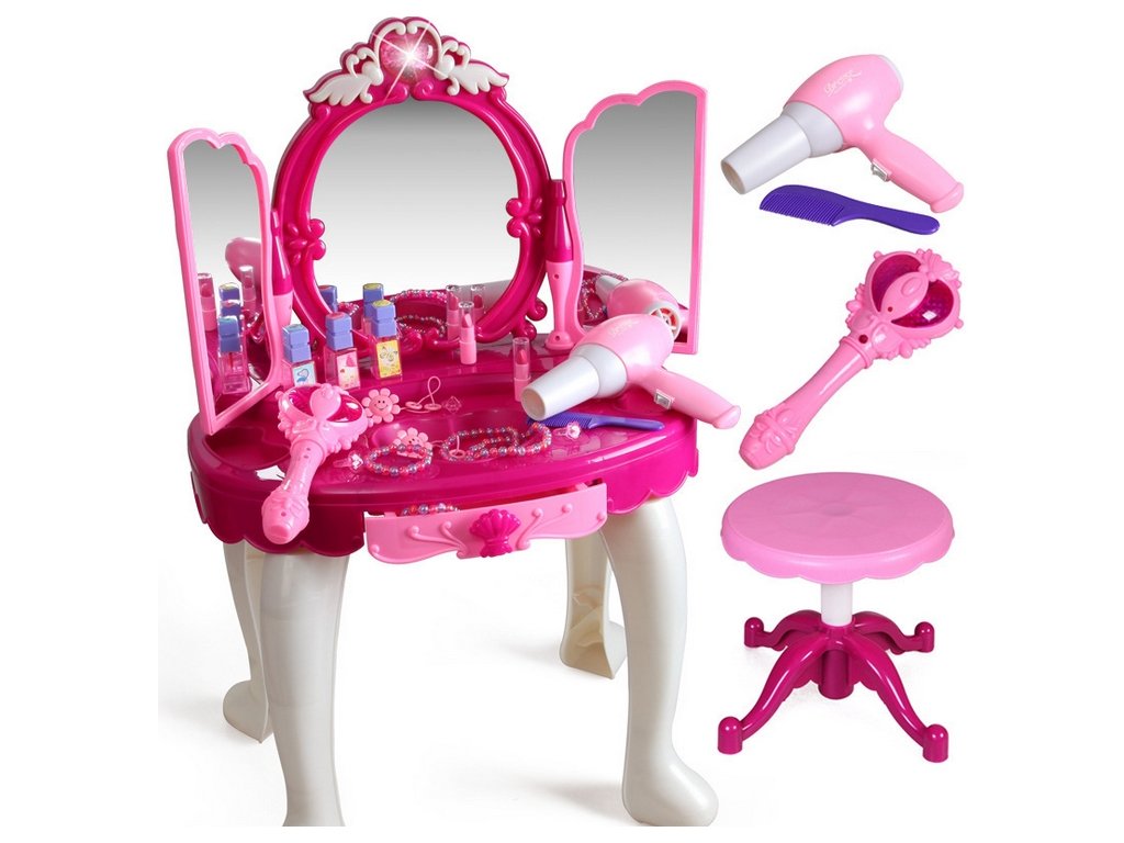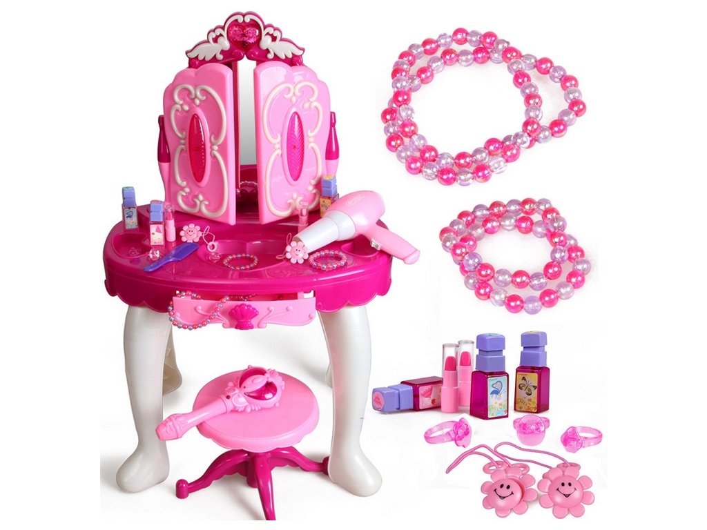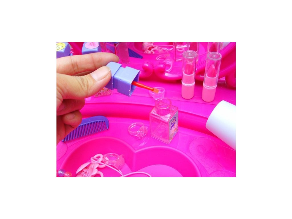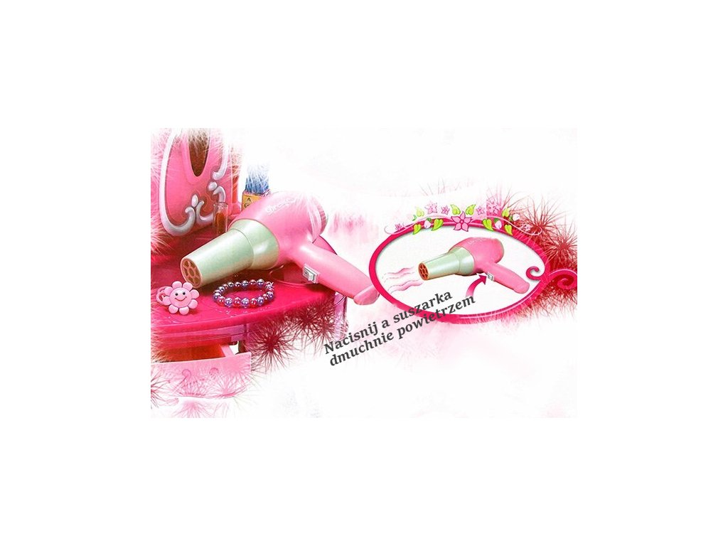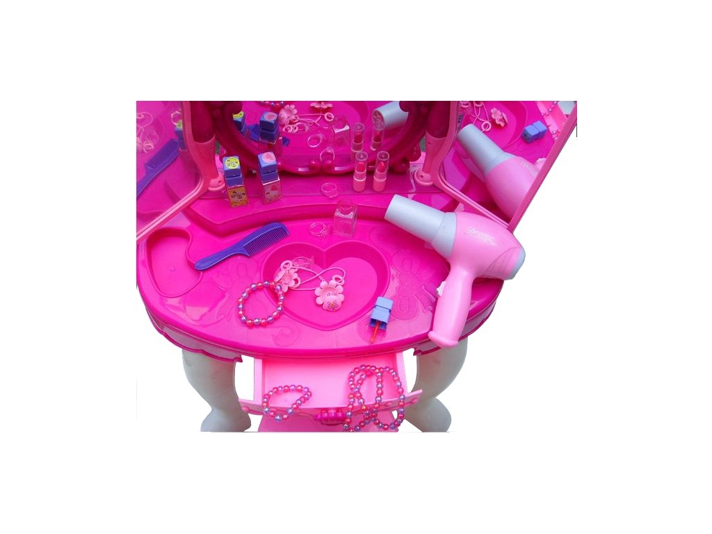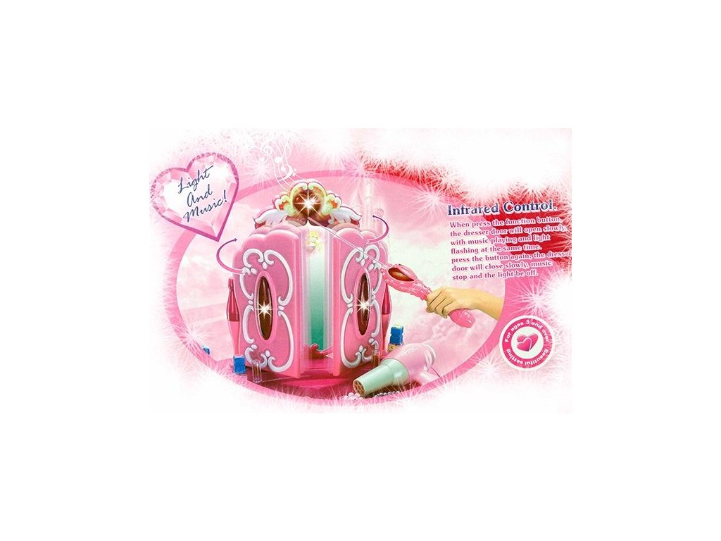 Różowa toaletka z automatycznie otwieranym lustrem za pomocą dołączonej różdżki, z dźwiękami, światełkami i możliwością podłączenia muzyki z MP3. Podczas otwierania na lusterku wyświetla się hologram z księżniczką. Lustra wykonane są z bezpiecznego nie zbijalnego materiału. Toaletkę wyposażono w otwieraną szufladę gdzie dziewczynka może przechowywać różne skarby. Załączono także krzesełko, dmuchającą suszarkę a także liczne akcesoria do makijażu i stylizacji.