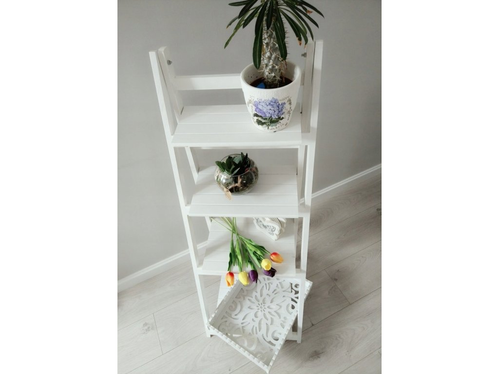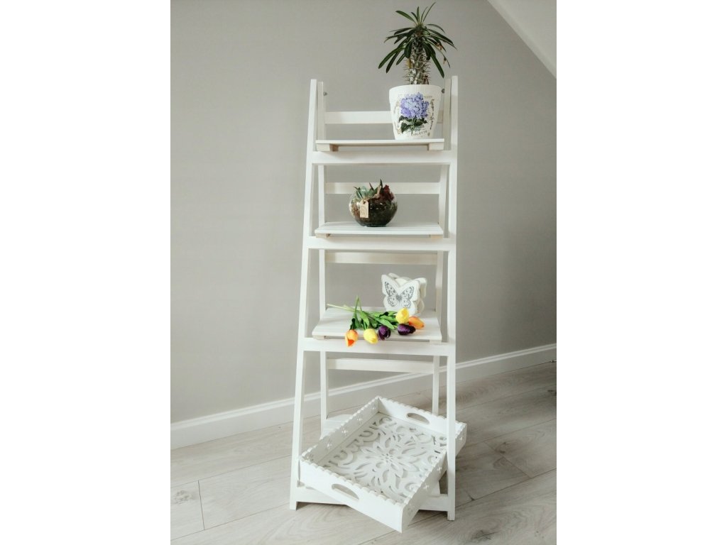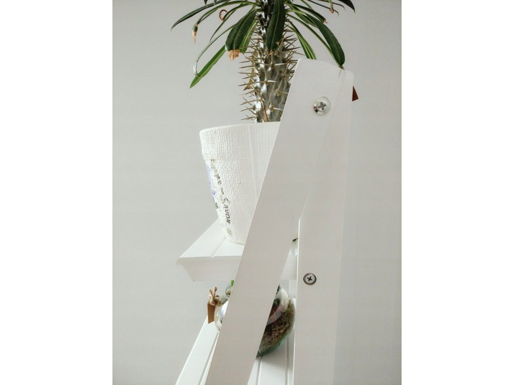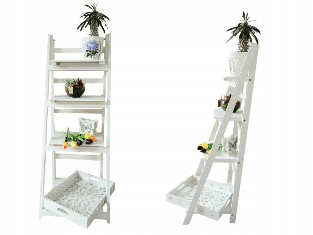 Regał został wykonany jako drabina ozdobna, która może posłużyć jako stojak na kwiaty lub miejsce do przechowywania różnego rodzaju przedmiotów. Stojak sprawdzi się także jako regał do łazienki, na którym możemy ułożyć kosmetyki lub przybory kąpielowe. To także doskonała propozycja do pokoju dziennego - kwietnik drewniany w kolorze białym idealnie wpasuje się zarówno w stylistykę skandynawską, rustykalną jak i nowoczesną. Wybierając nowoczesne kwietniki do salonu strzałem w dziesiątkę może okazać się drabina półka jako drewniany stojak na kwiaty, na którym zmieści się sporo doniczek. Taki kwietnik nowoczesny ożywi każde wnętrze dodatkowo posiadając swoją funkcję praktyczną.