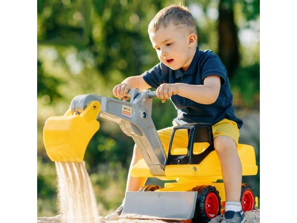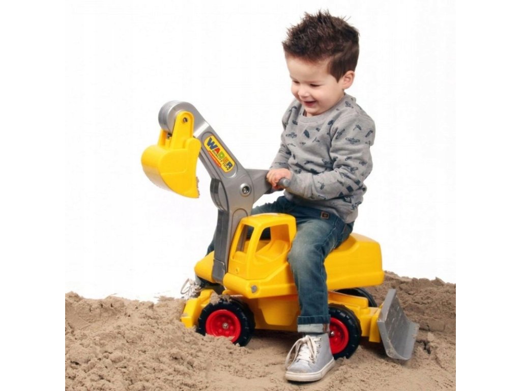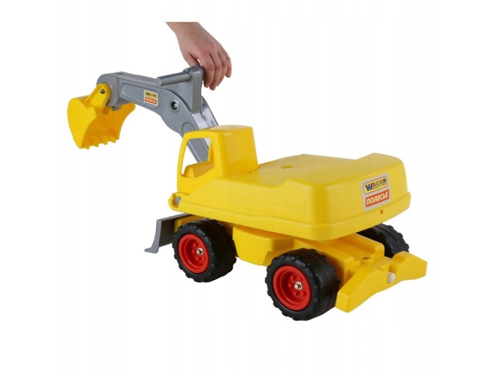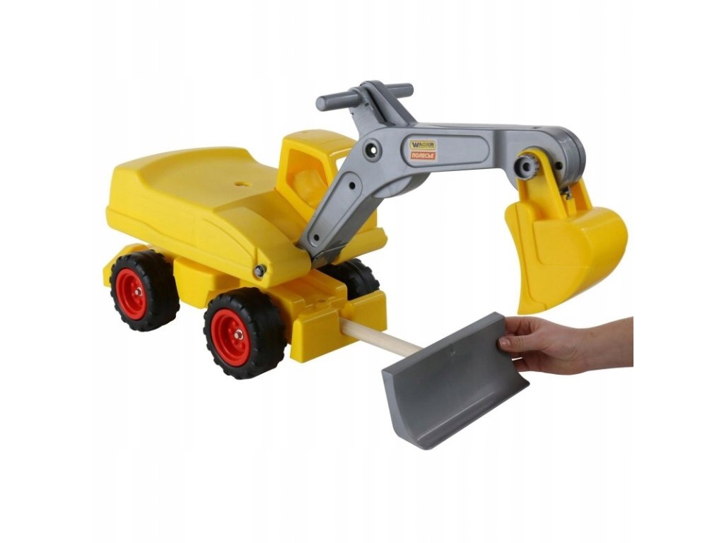 Koparka posiada w pełni funkcjonalny wysięgnik sterowany przy pomocy dwóch uchwytów. Pojazd może wykonać obrót o 360 stopni wokół pionowej osi, dodatkowo posiada spychacz, który w bardzo łatwy sposób można zdemontować. Ponadto koparka posiada duże, wygodne i wyprofilowane siedzisko. Produkt został wykonany z najwyższej jakości tworzyw sztucznych i został zachowany w pięknej i żywej kolorystyce.
