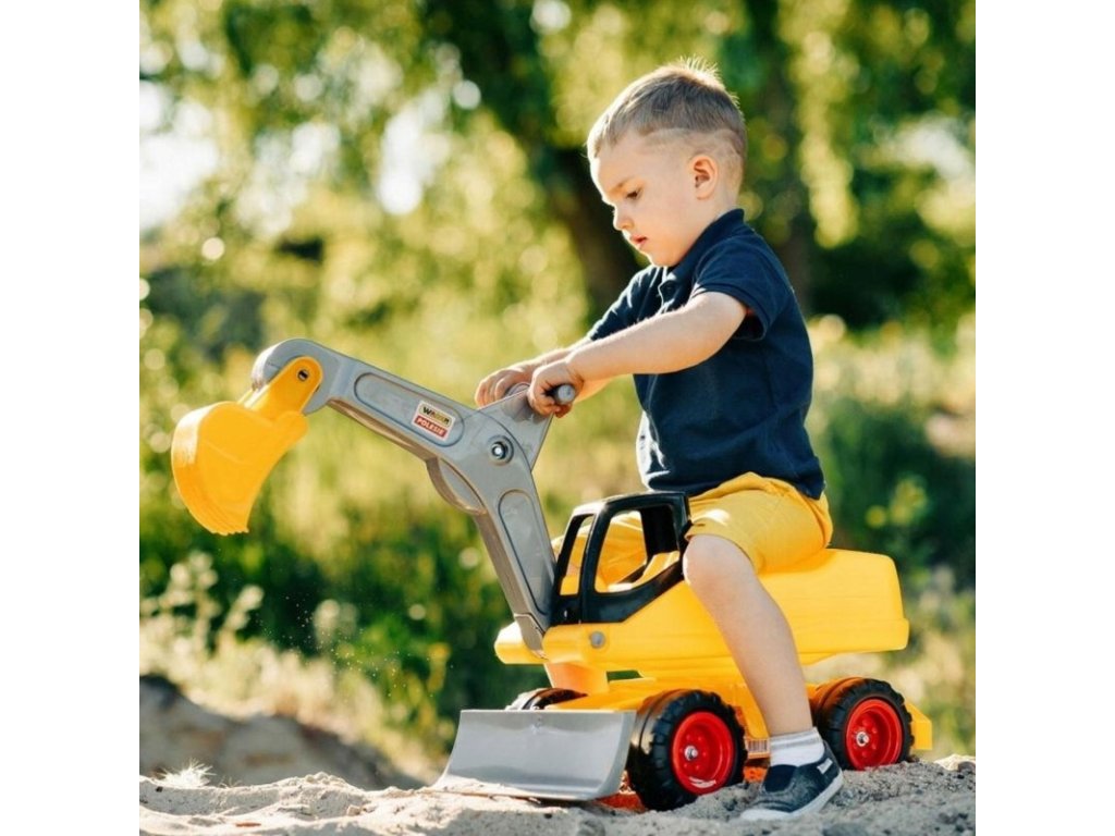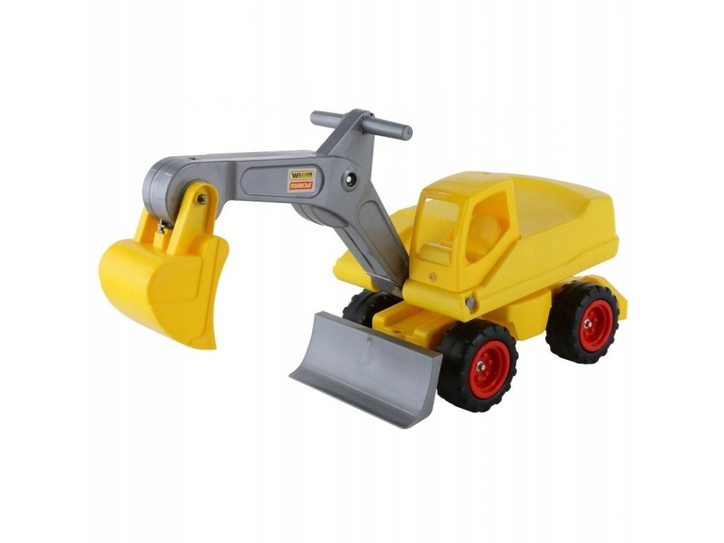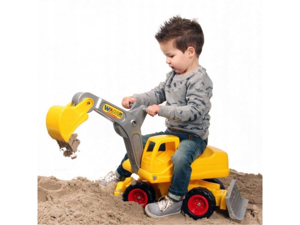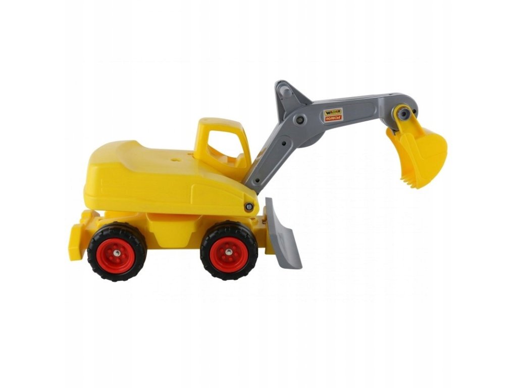 Koparka posiada w pełni funkcjonalny wysięgnik sterowany przy pomocy dwóch uchwytów. Pojazd może wykonać obrót o 360 stopni wokół pionowej osi, dodatkowo posiada spychacz, który w bardzo łatwy sposób można zdemontować. Ponadto koparka posiada duże, wygodne i wyprofilowane siedzisko. Produkt został wykonany z najwyższej jakości tworzyw sztucznych i został zachowany w pięknej i żywej kolorystyce.