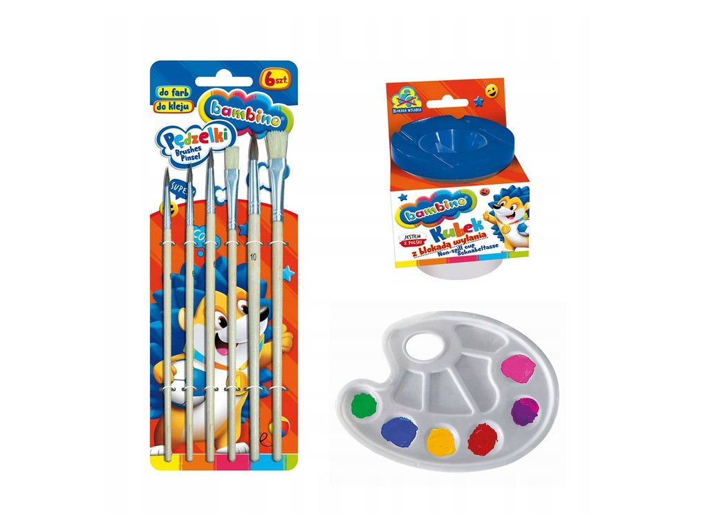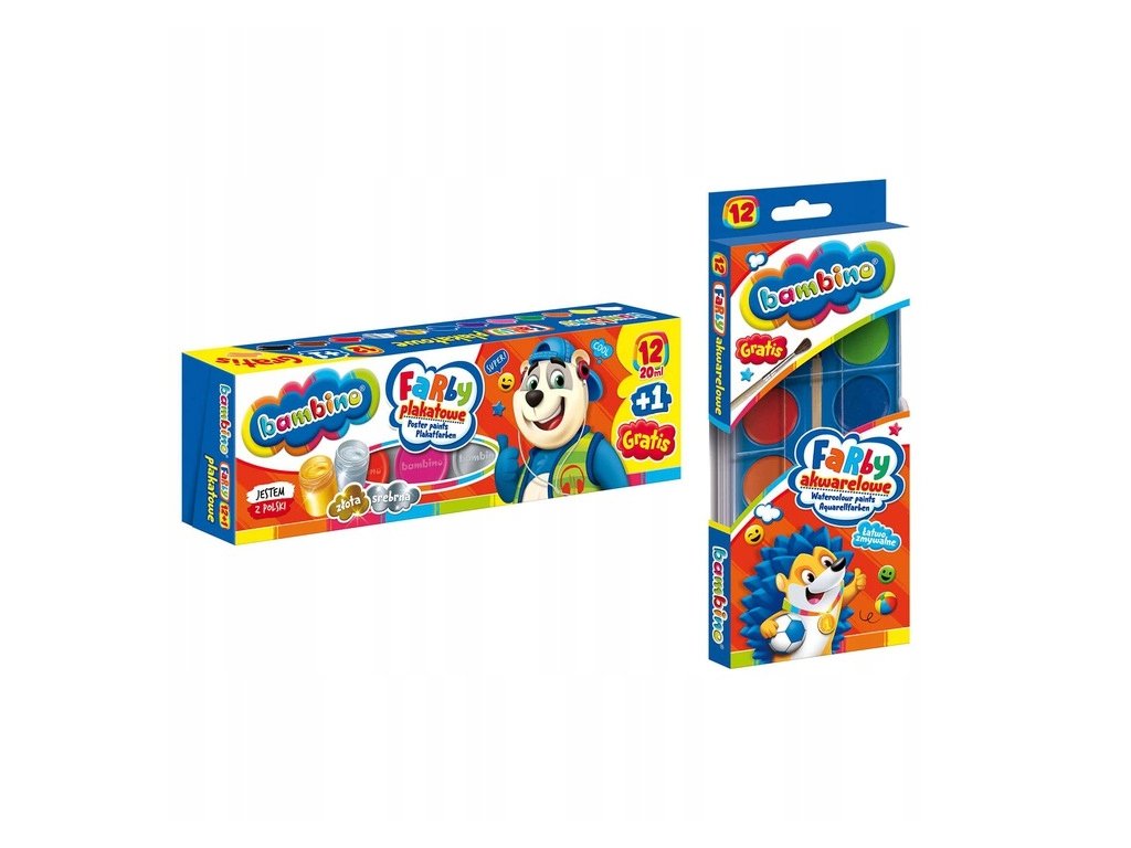 Akvarelové farby sú farby na vodnej báze vo forme suchých pastiliek, ktoré sú po navlhčení pripravené na použitie. Tieto farby sú určené deťom a tínedžerom, ktorí chcú vytvárať umelecky vyspelejšie diela, najmä krajiny alebo portréty. Akvarely Bambino vám umožňujú dosiahnuť účinky svietivosti, jemnosti, rozmazania kontúr a hry svetla. Môžu byť použité v technikách kombinovaných s plagátovými farbami, temperou alebo rôznymi druhmi pasteliek. Akvarelové farby Bambino sa vyznačujú bohatou paletou intenzívnych farieb, kvalitou a bezpečnosťou používania.