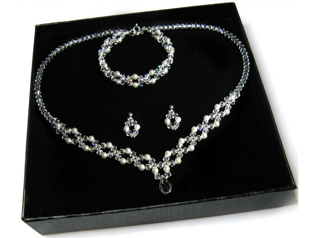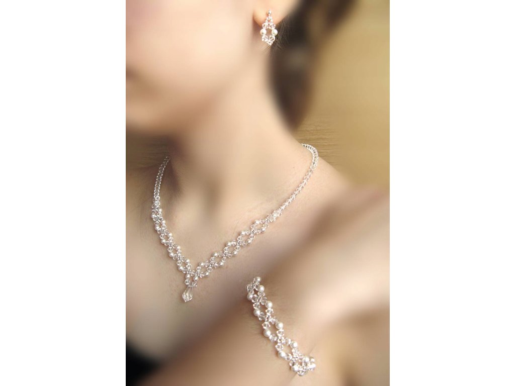 Wykonany jest z kryształów i pereł firmy Swarovski Elements wielkości 4 mm, kryształów Swarovski Elements wielkości 15mm  oraz srebra p. 925 (próba bita na zapięciu)