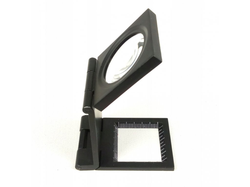 Szkło powiększające kompaktowe ze składaną nóżką i podziałką. Lupa jest wykorzystywana zarówno do szczegółowych oględzin jakości naświetlenia matrycy jak i wszelkiego rodzaju wydruków cyfrowych lub offsetowych.