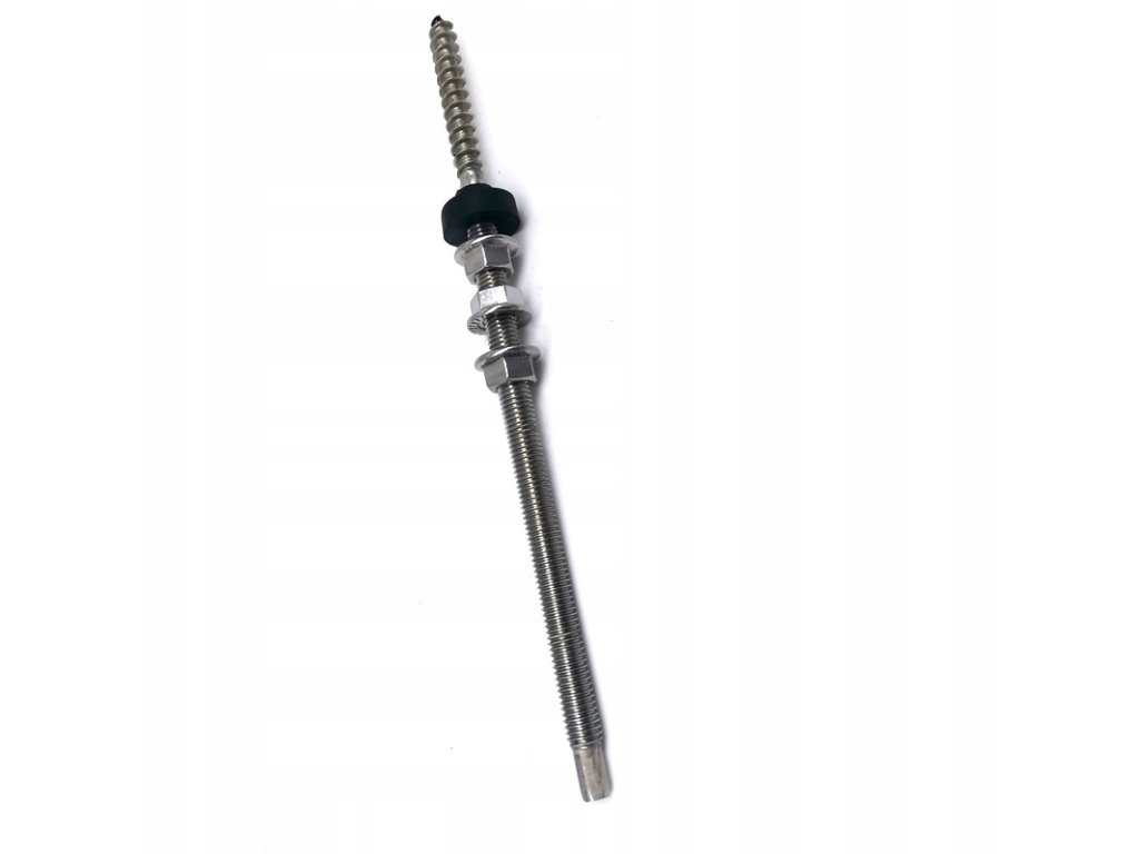 Wysokiej jakości śruba z podwójnym gwintem M10  z adapterem przeznaczona jest do montażu paneli fotowoltaicznych na dachach budynków pokrytych blachą , blachodachówką , papą , gontem itp.