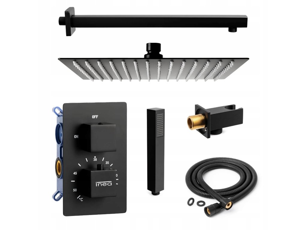 Black batéria pod omietku termostat značky INEA sa používa pre montáž dvoch prvkov lúče. Systém podporuje sprchovací kút batérie dažďovou sprchou a telefón.