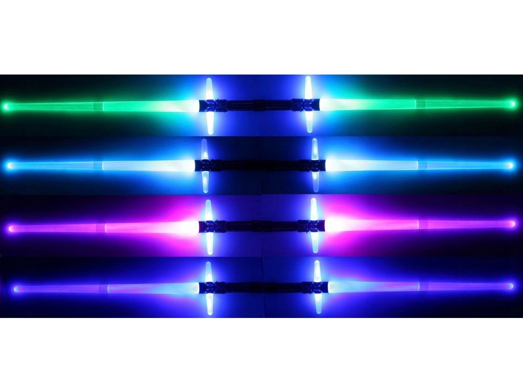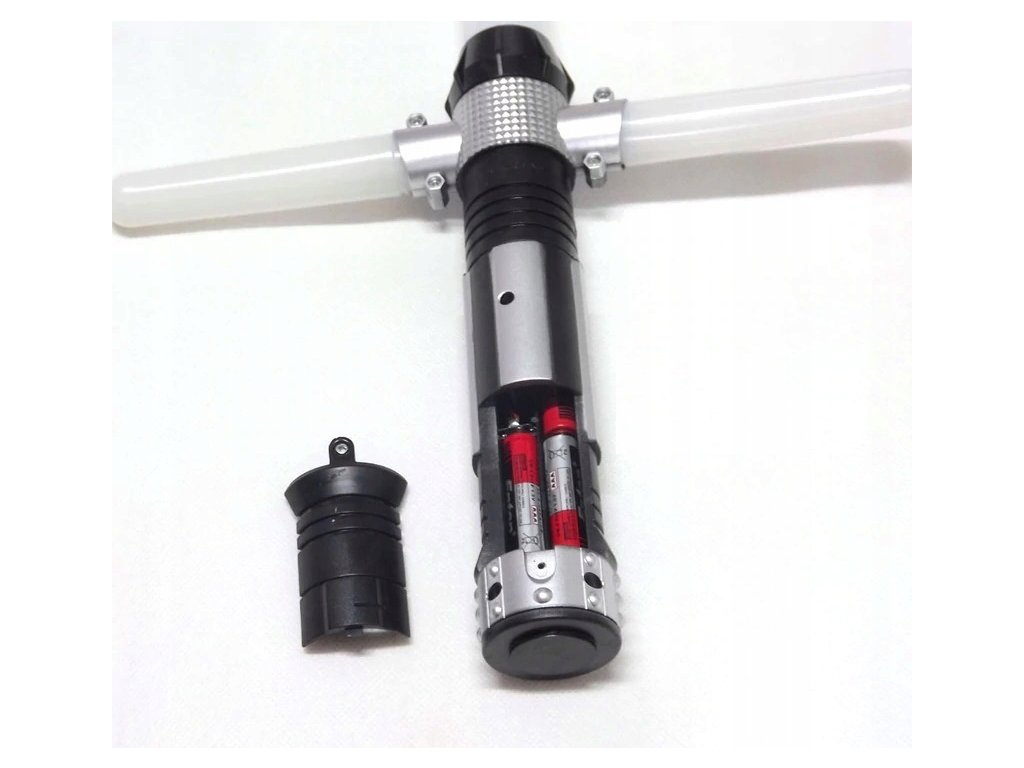 Jeden miecz ma długość ok 85cm. Dzięki złączce, która jest w zestawie można je ze sobą połączyć. Wtedy miecz wygląda jak na zdjęciu obok i ma długość ok 170cm. Boki miecza czyli Jelec są wkręcane, również świecące. Mają długość ok 30 cm.