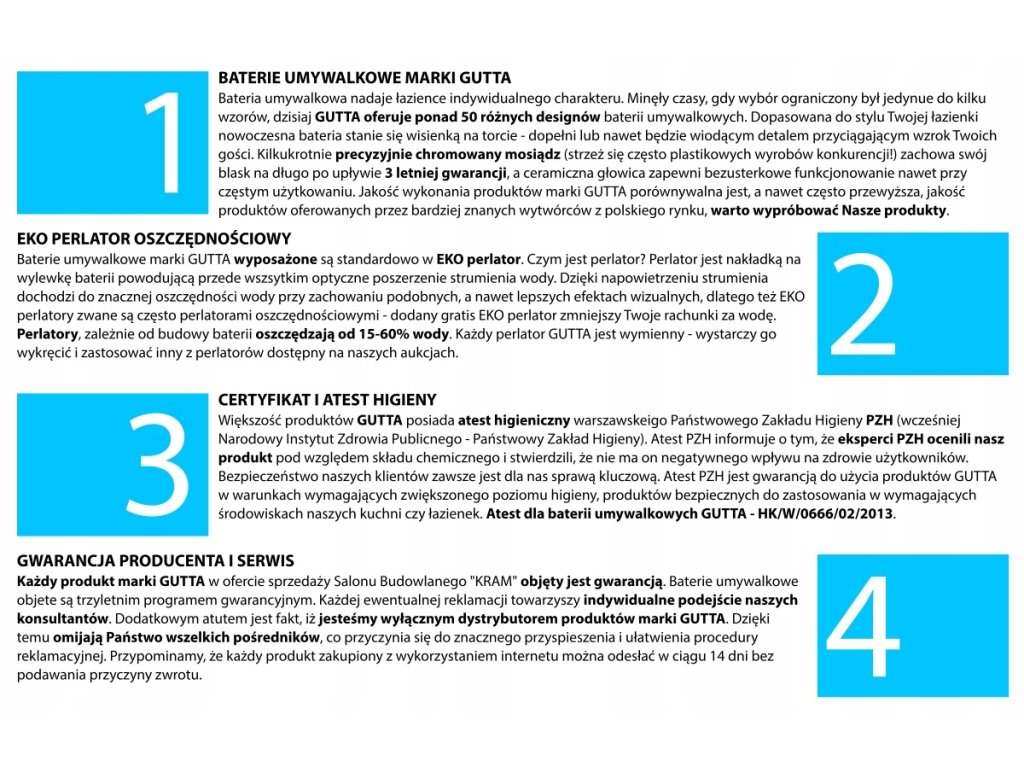 Jednootworowa, dwuuchwytowa, stojąca bateria umywalkowa mieszająca marki GUTTA w popularnym ostatnio stylu RETRO. Marka GUTTA przebojem wchodzi na rynek, stając się powoli uosobieniem jakości wykonania i przystępnych cen. Nawet produkty w wersjach premium zaskakują ceną.