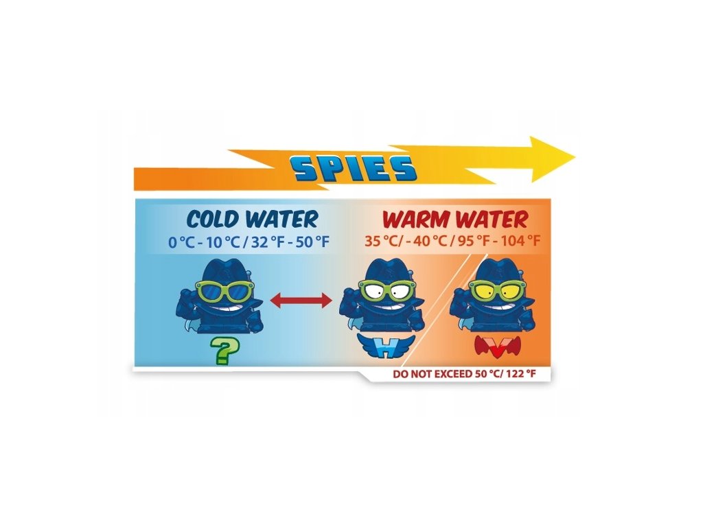 Aby się o tym przekonać, umieść ich w ciepłej wodzie (35ºC - 40ºC), a kolor ich oczu zostanie ujawniony: biały dla bohaterów lub żółty dla złoczyńców. Umieść je z powrotem w zimnej wodzie (0ºC - 10ºC), aby ponownie zakamuflować oczy! Czy będziesz jednym ze szczęśliwców, którzy odnajdą nowego, niezwykle rzadkiego bohatera SUPER THINGS OCULUS MAX? W tej serii Secret Spies ultra rzadki zmienia kolor, gdy umieścisz go w gorącej wodzie!