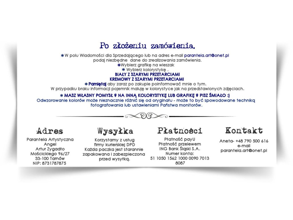 W przypadku braku informacji, wieszak maluję w kolorystyce i grafiką jak na przedstawionych zdjęciach.