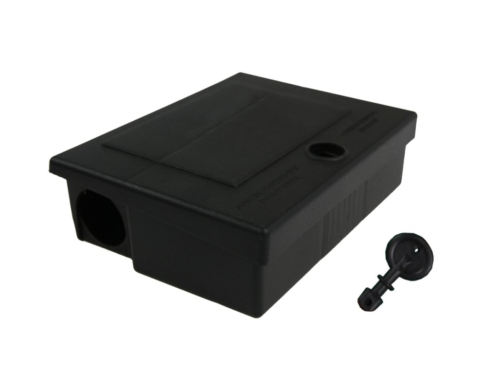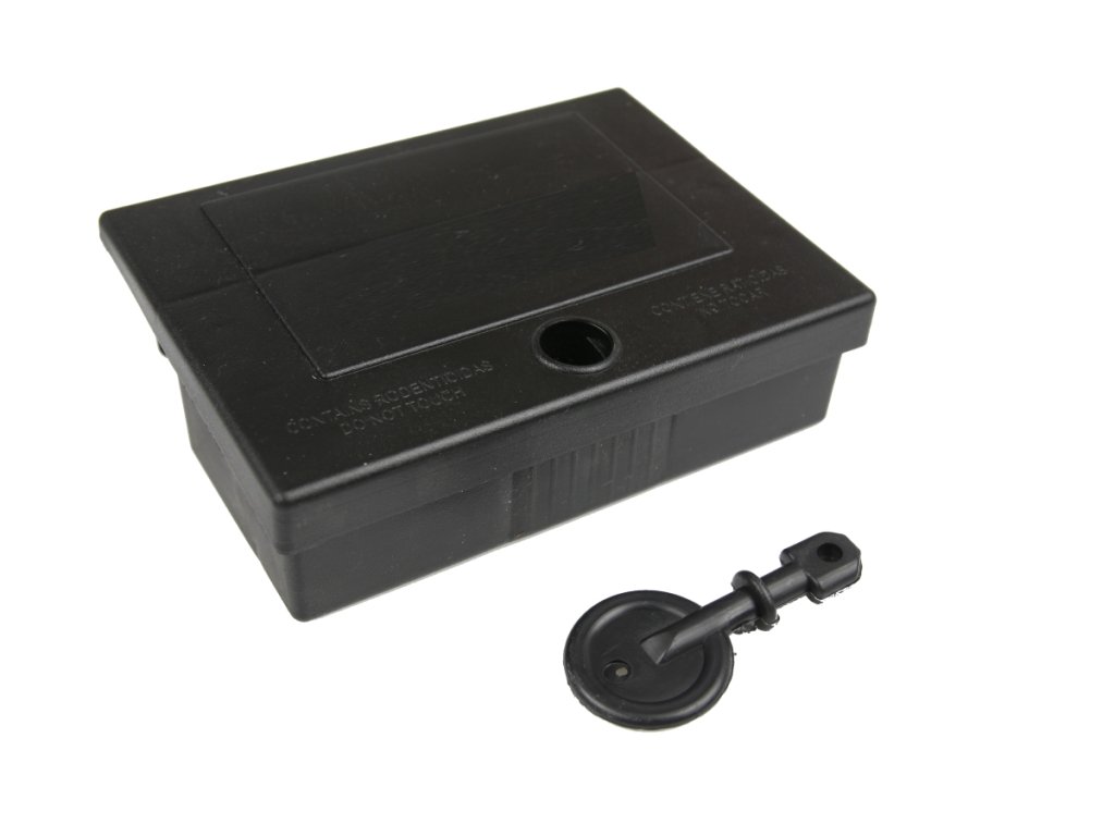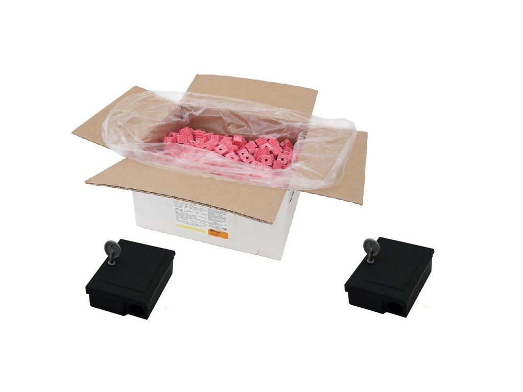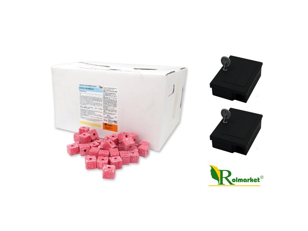 Zestaw składa się z 15kg trutki Muribrom w postaci kostki i 2 sztuk karmników deratyzacyjnych na myszy z kluczykami.