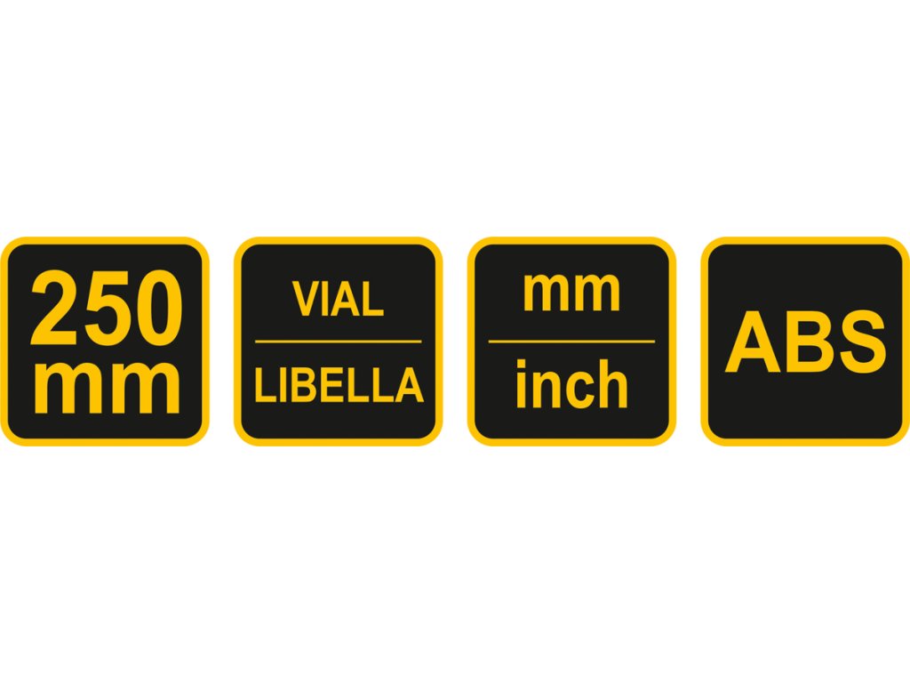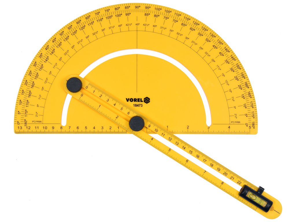 Przeznaczony do pomiarów wartości kątów. Wykonany z odpornego tworzywa ABS.Posiada ruchome ramię o długości 250 mm, blokowane wkrętami. Skuteczność pomiarów wzrasta dzięki zastosowaniu specjalnej ruchomej libelli, którą możemy zamontować na ramieniu kątomierza. Skala wyraźnie cechowana. Na podstawie podziałka milimetrowa na ruchomym ramieniu milimetrowa i calowa a na obwodzie podziałka kątowa co 1°. Czarne znakowanie na żółtym tle znakomicie poprawia widoczność.