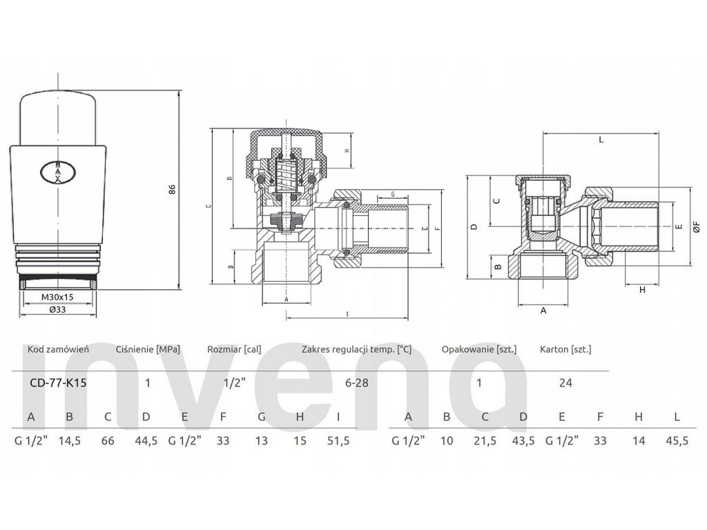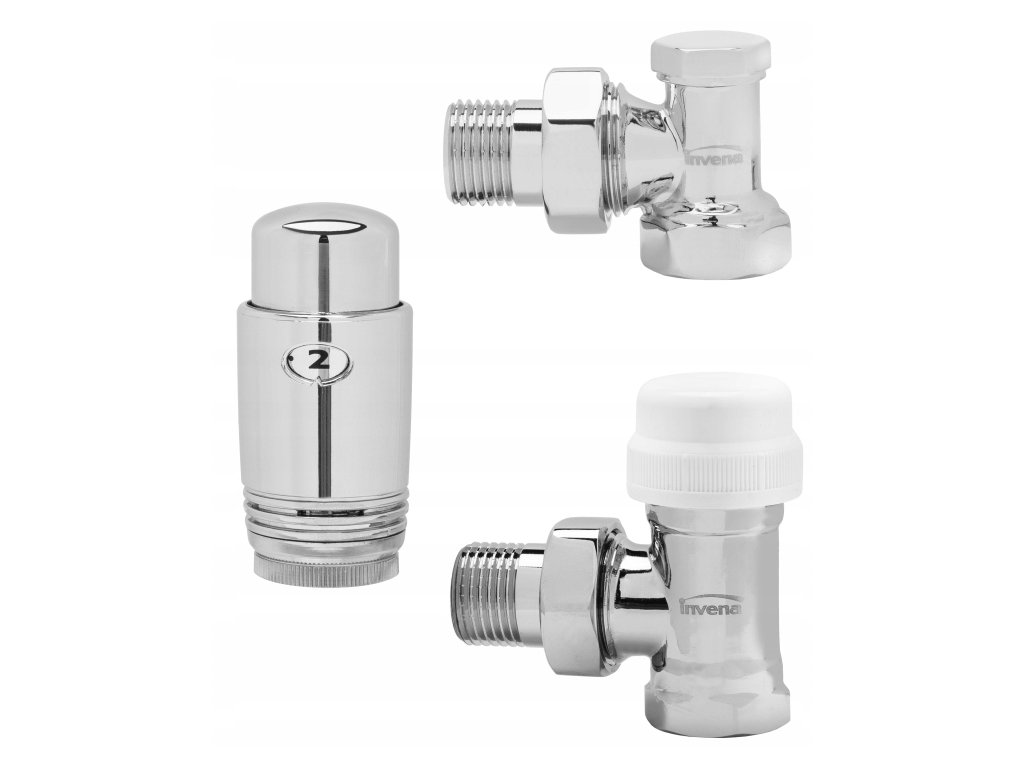 INVENA ZAWÓR TERMOSTATYCZNY KĄTOWY CHROM Z GŁOWICĄ + ZAWÓR POWROTNY CHROM