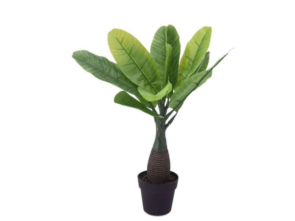 Dekoracyjna i syntetyczna roślina doniczkowa o dużych rozłożystych liściach z rodziny palmowatych. Kwiat w czarnej doniczce, wypełnionej ciemnymi drobnymi kamyczkami. Prezentuje się niezwykle realistycznie i elegancko. Będzie idealnym wykończeniem salonu, jadalni lub biura.