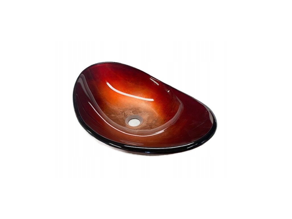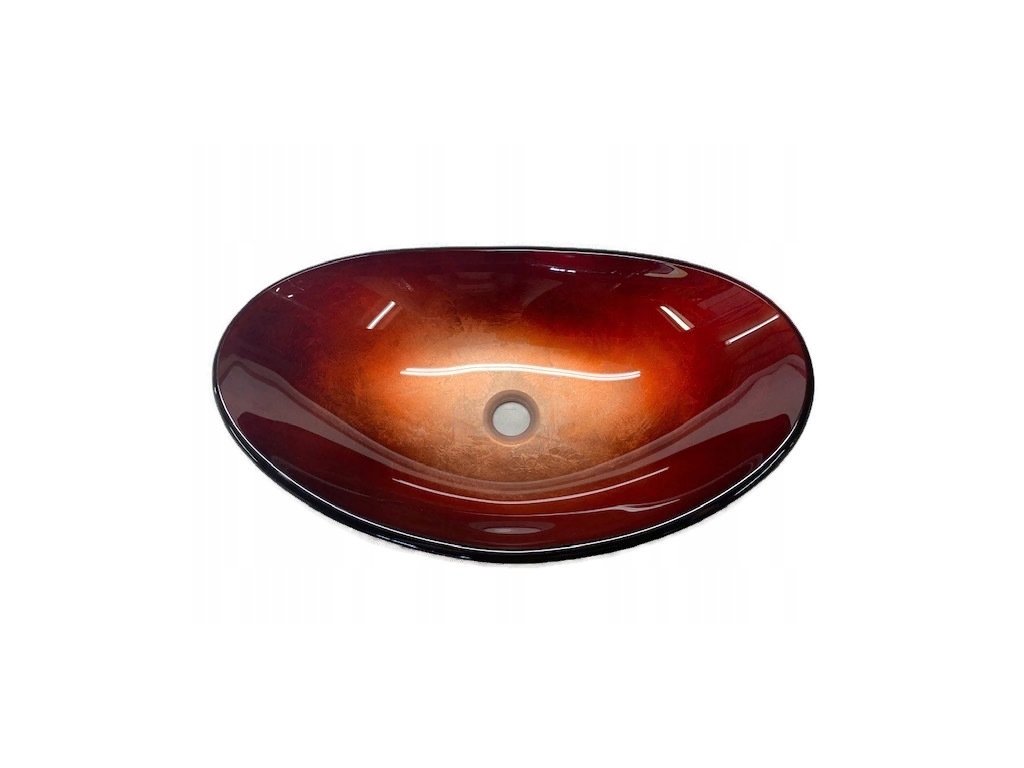 Przedmiotem oferty jest przepiękna owalna umywalka do zamontowania na blacie, z grubego szkła hartowanego. Kolorystyka przechodząca od koloru czarnego poprzez czerwień