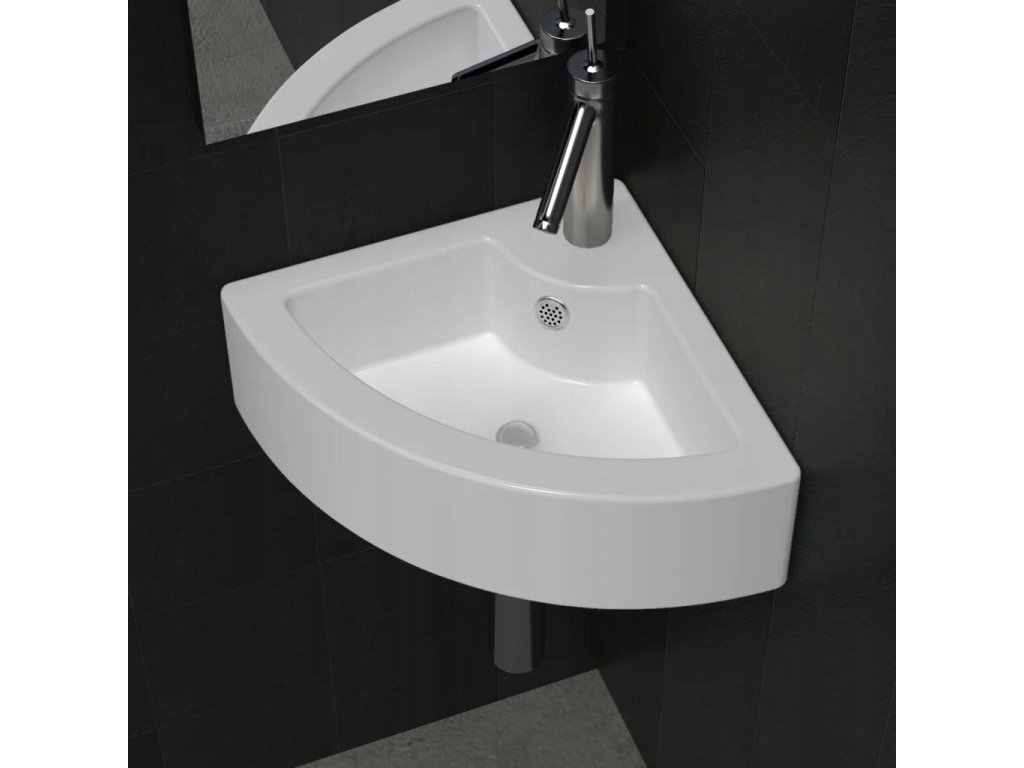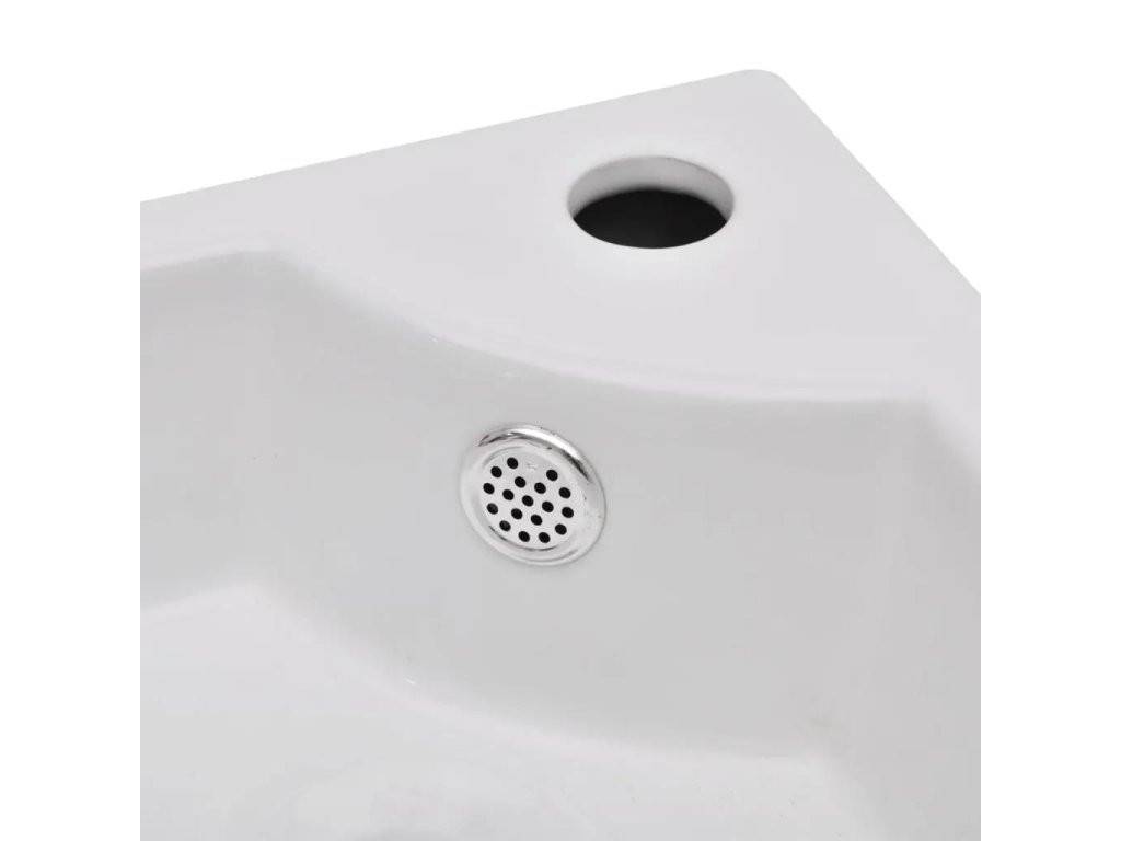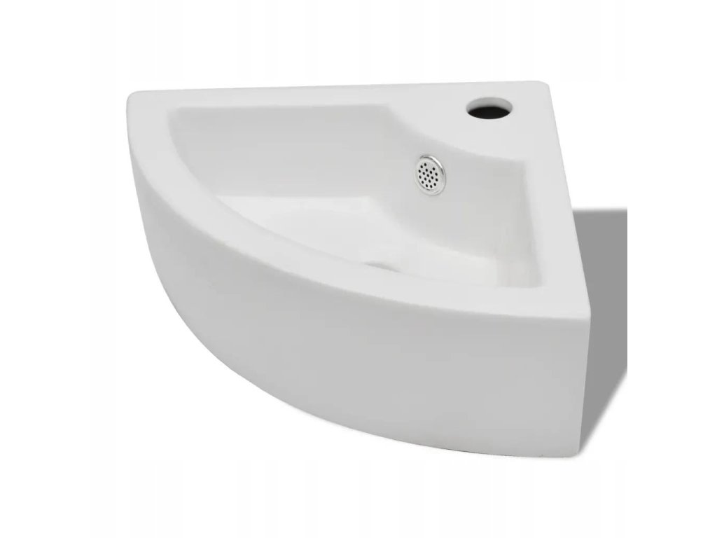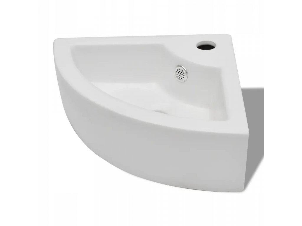Wykonana z ceramiki, narożna umywalka będzie eleganckim i ponadczasowym dodatkiem do każdej łazienki lub toalety. Ta umywalka łazienkowa jest nie tylko przedmiotem codziennego użytku, lecz także wspaniałą ozdobą Twojego domu. Dzięki modnemu, nowoczesnemu wzornictwu i lśniącej, białej barwie, będzie pasować do każdego wystroju. Wykonana z ceramiki umywalka jest bardzo łatwa w czyszczeniu. Wykończenie na wysoki połysk dodaje jej uroku. Wyposażona w przelew umywalka wydajnie odprowadzi wodę w przypadku gdy zgromadzi się jej zbyt dużo. Co więcej, posiada ona również otwór montażowy na baterię. Prosimy mieć na uwadze, że kran i odpływ nie są częścią zestawu.