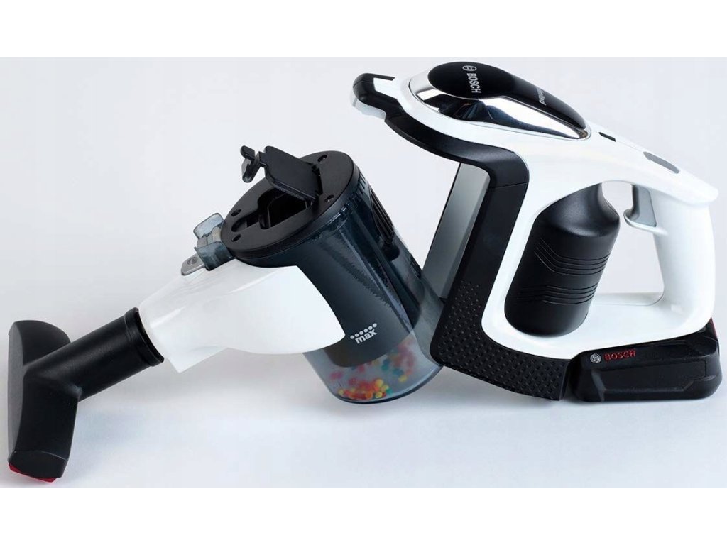 Zabawkowy odkurzacz pionowy jest w kolorze biało-czarnym ze srebrną rurą. Został wyposażony w lampkę LED i wirujące kuleczki, dzięki czemu do złudzenia przypomina oryginalny produkt marki Bosch. Posiada otwierany zbiorniczek na śmieci, który można samemu opróżnić. Odkurzacz został także wyposażony w dwie różne końcówki - szeroka szczotka podłogowa jest ruchoma i posiada obracający się wałek. Zabawka z zamontowaną rurą ma aż 80 cm wysokości. Możemy ją również w prosty sposób odłączyć i cieszyć się małym, ręcznym odkurzaczem.