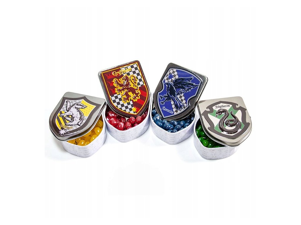 Pyszne owocowe fasolki w czterech metalowych puszkach na których znajdują się cztery godła szkół Hogwartu.
