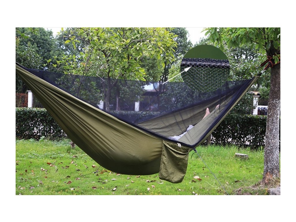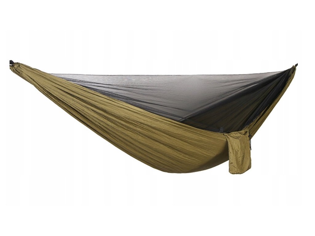 - moskitiera zapewnia dobrą ochronę przed komarami i innymi owadami. Z jednej strony na stałe przyszyta do hamaka , a z drugiej ma rozpinany zamek błyskawiczny