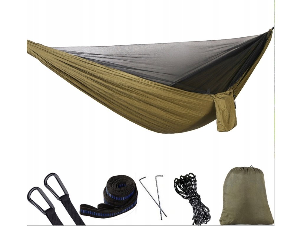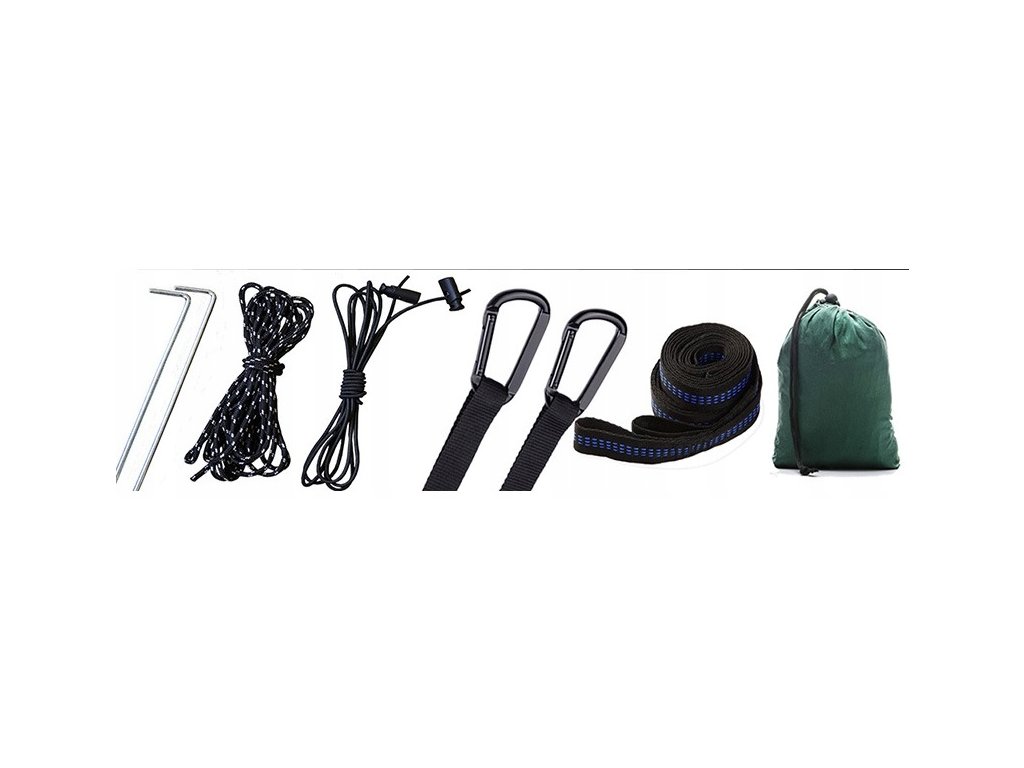 Zawartość opakowania: 1 x hamak z moskitierą, 2 x karabińczyk do zaczepienia o pasy, 2 x mocny pas , 2 x sznur + 2 x szpilki do bocznej stabilizacji ( zaczepienia o szpilkę wbitą do ziemi ), gumowa linka do montażu moskitiery