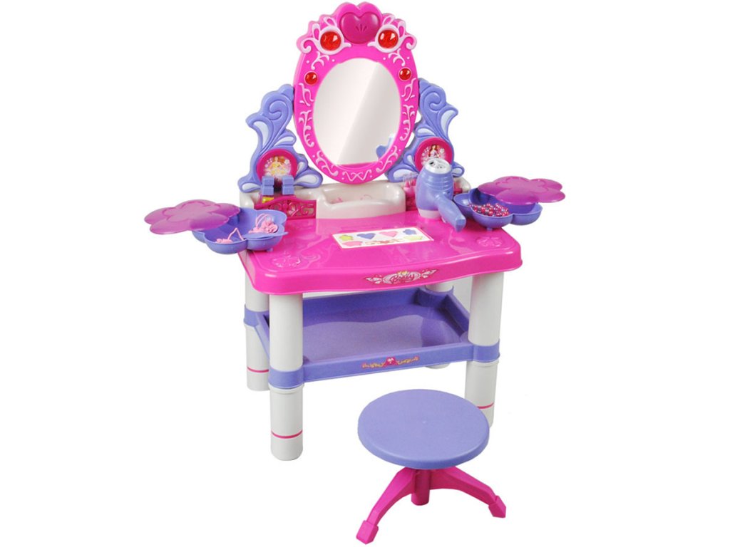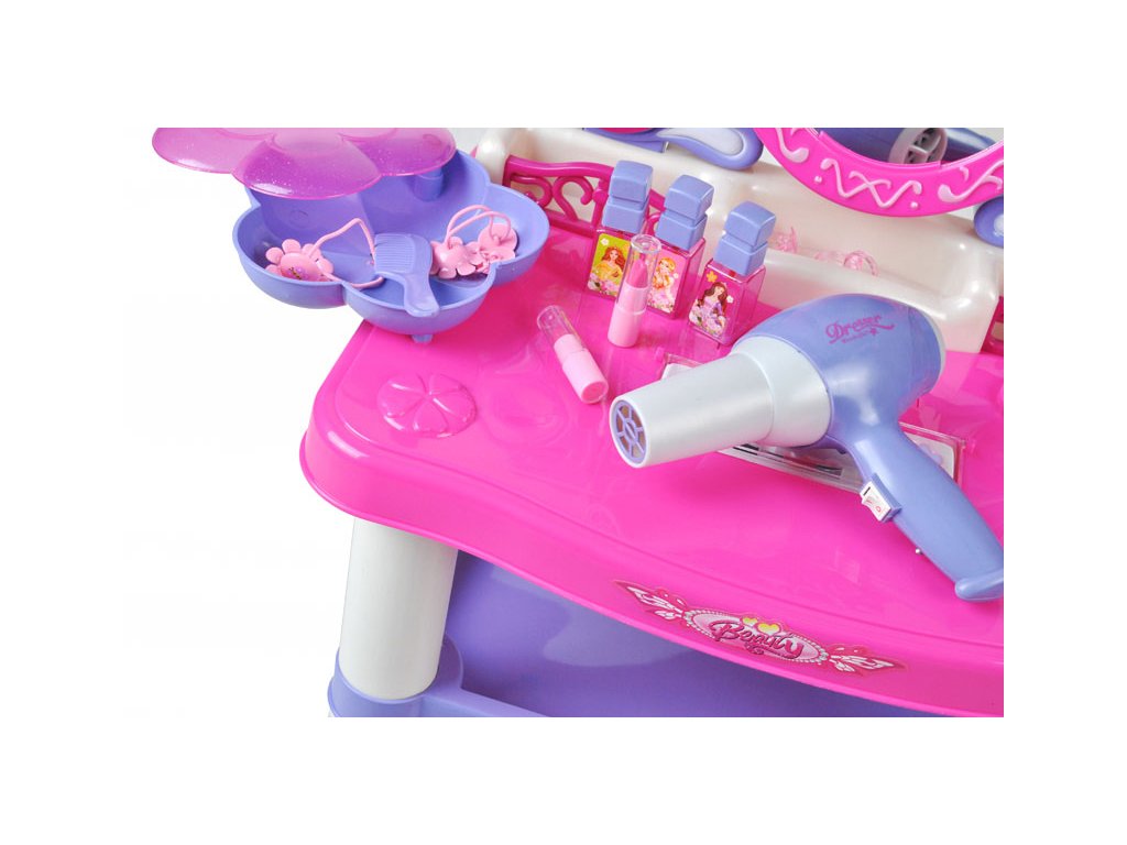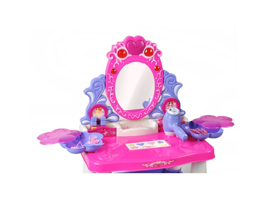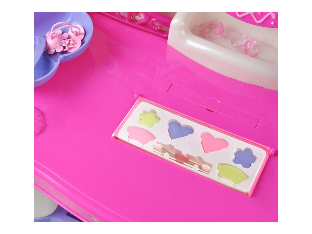 Toaletka posiada grające, obrotowe lustro - wystarczy nacisnąć guzik a zacznie grać i migać światełkami. Dodatkowo, piękne rozsuwane pojemniki pomagają utrzymać porządek. Ponadto zabawka posiada półeczki, dzięki którym mała księżniczka schowa biżuterię lub inne skarby.