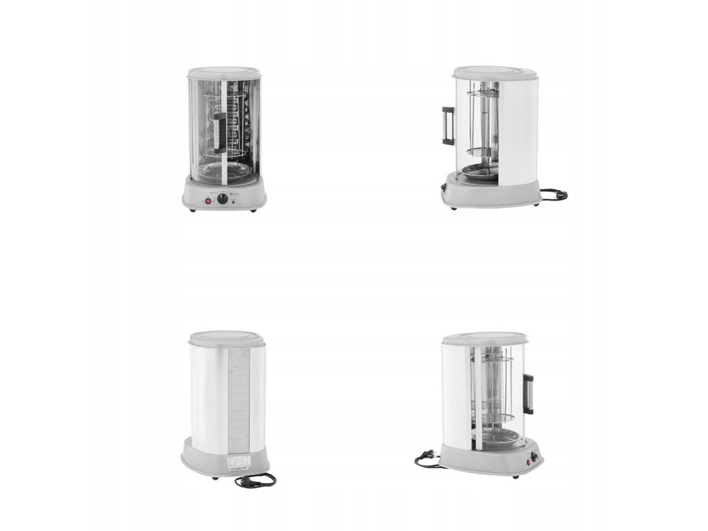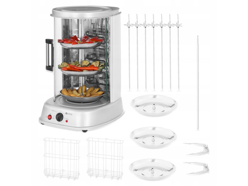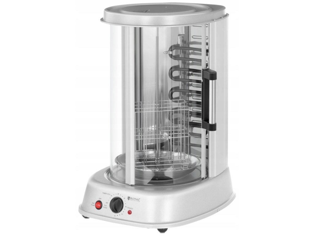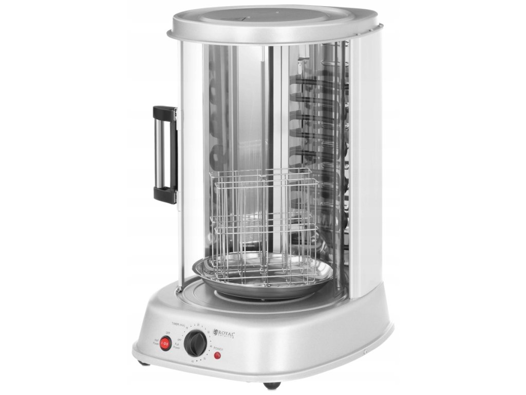 Profesjonalny grill pionowy marki Royal Catering służy do równomiernej, beztłuszczowej termicznej obróbki żywności. Model RCGV-1800 o pojemności 31l sprawdza się jako sprzęt 4w1, ponieważ wyposażono go w: rożen z widełkami (np. do kebaba i kurczaka), szpikulce (m.in. do szaszłyków), tace (do warzyw i owoców) oraz uchwyt (do udek drobiowych, panini, ryb). Wszystkie akcesoria wykonano ze stali szlachetnej. Nadają się do mycia w zmywarce.