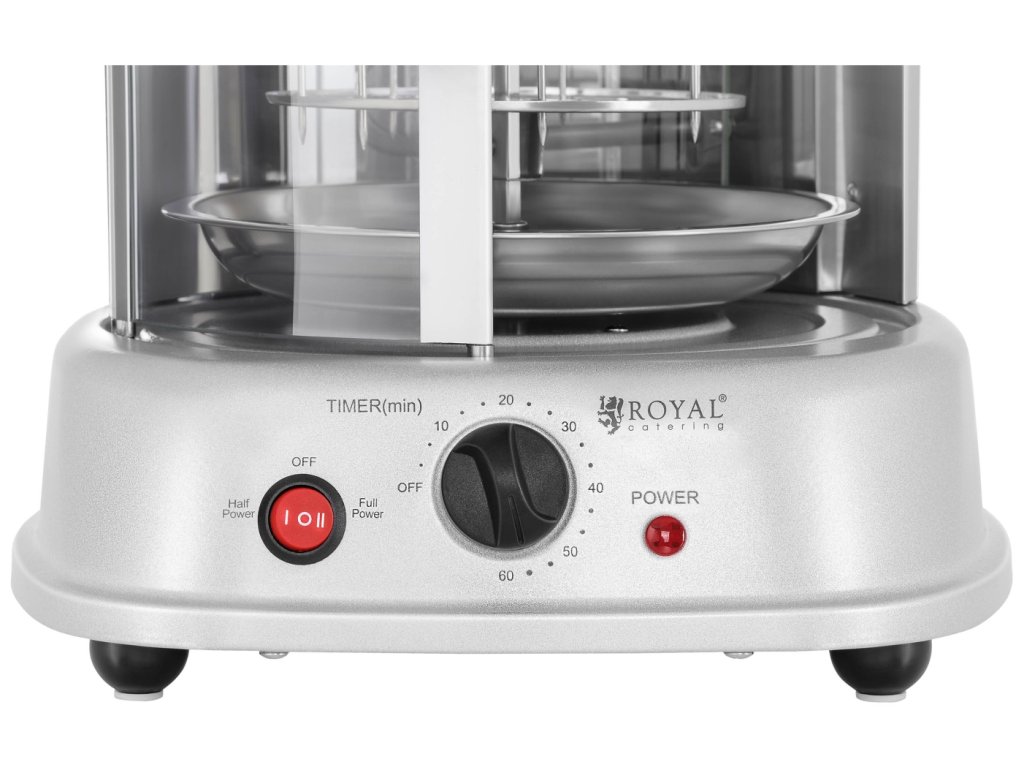 Moc 1800W sprawia, że obrotowy opiekacz do kebaba mini szybko osiąga temperaturę 160°C. Przyciski Half Power i Full Power pozwalają ustawić połowę mocy albo jej pełen zakres. Bezpieczne użytkowanie grilla zapewnia funkcja timer. Po upływie ustawionego czasu (maks. 60 minut) sprzęt sygnalizuje zakończenie pracy i automatycznie się wyłącza.