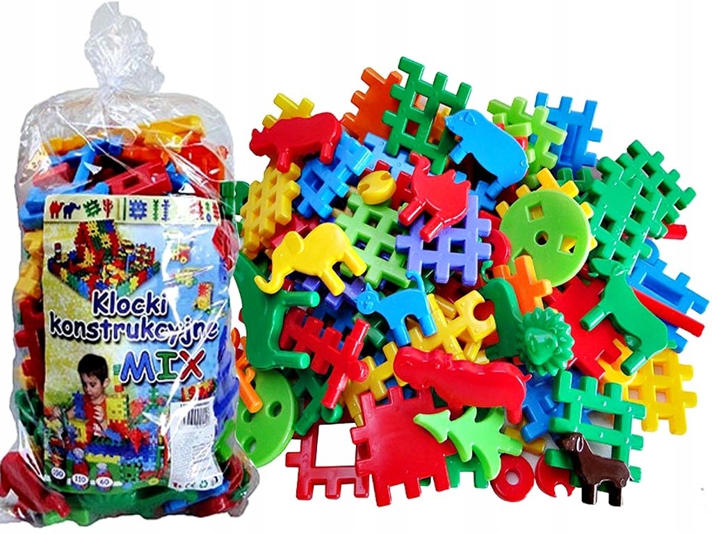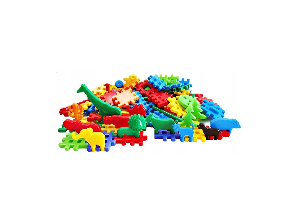 • Zestaw konstrukcyjny /110 elementów/ zawiera łatwe w montażu klocki-wafle różnych kształtów, kółka, choinki, zwierzęta domowe, safari... etc..