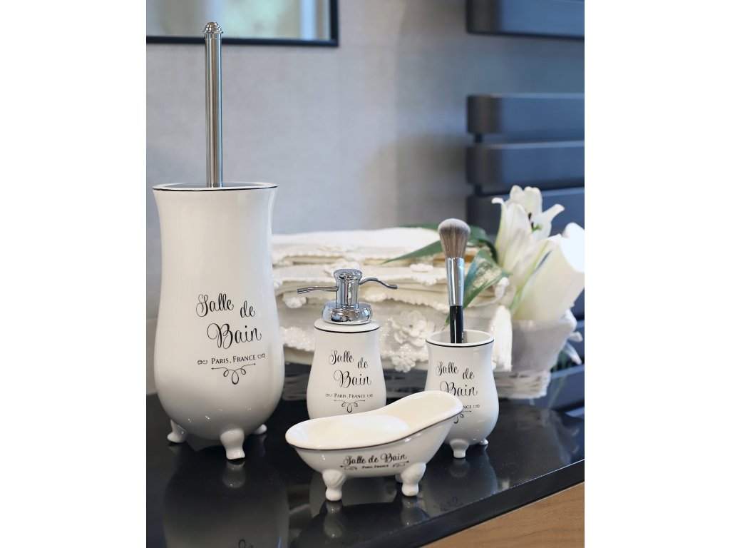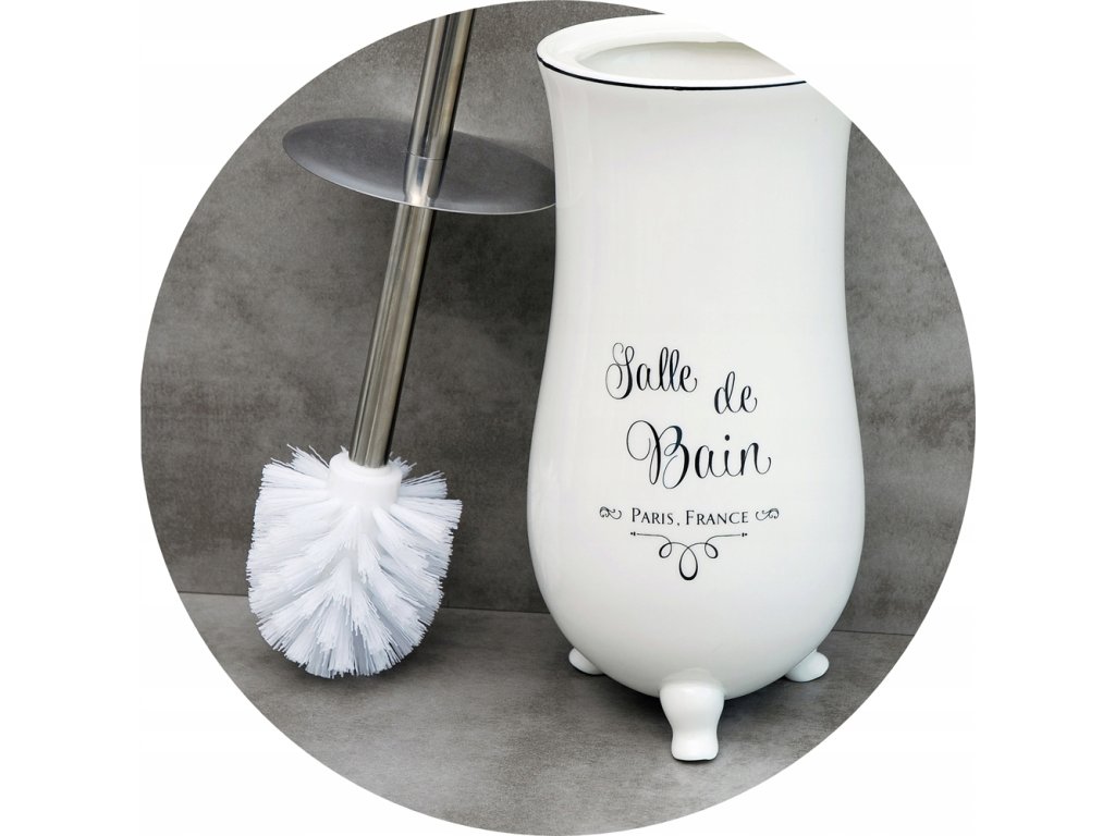 Unikátna toaletná kefa s nádobou v mierne sivobielej farbe vyrobená z kvalitného zaskleného porcelánu. Toto je časť série Salle de Bain z Yoka Home z kolekcie Premium. Praktické a ľahké na čistenie. Na prednej časti „Salle de Bain PARIS, FRANCÚZSKO“ je čierny nápis. Perfektne zapadá do kúpeľňovej výzdoby v nadčasovom retro štýle alebo vo francúzskom usporiadaní.