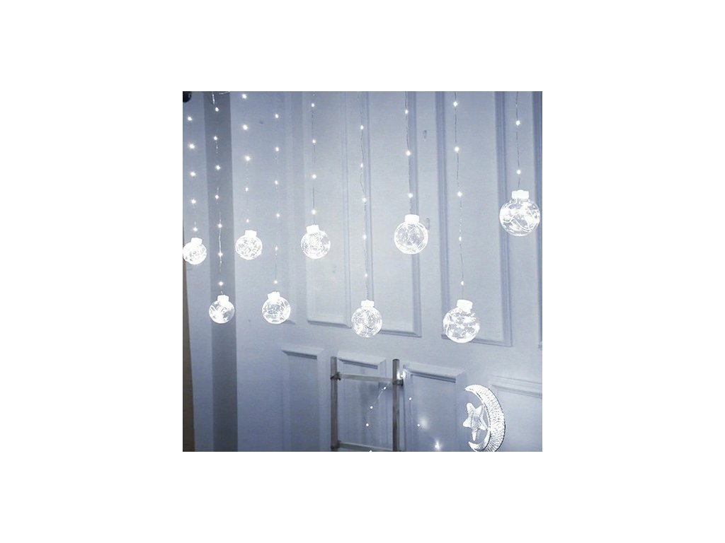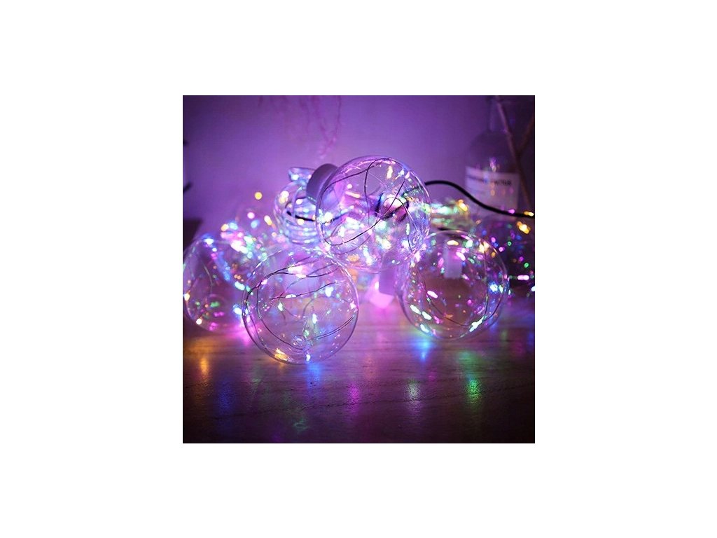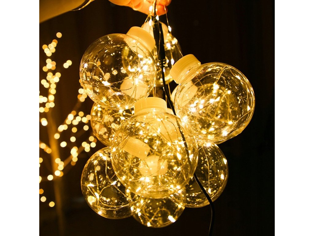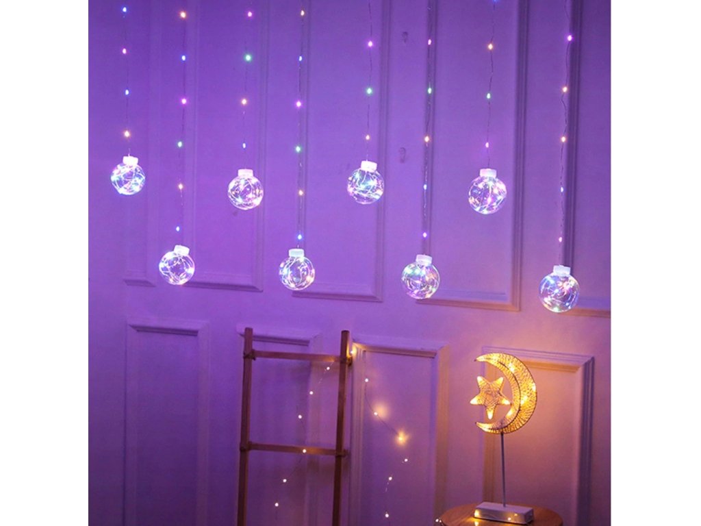 Kule wiszą na cienkich drucikach z punktami świetlnymi.