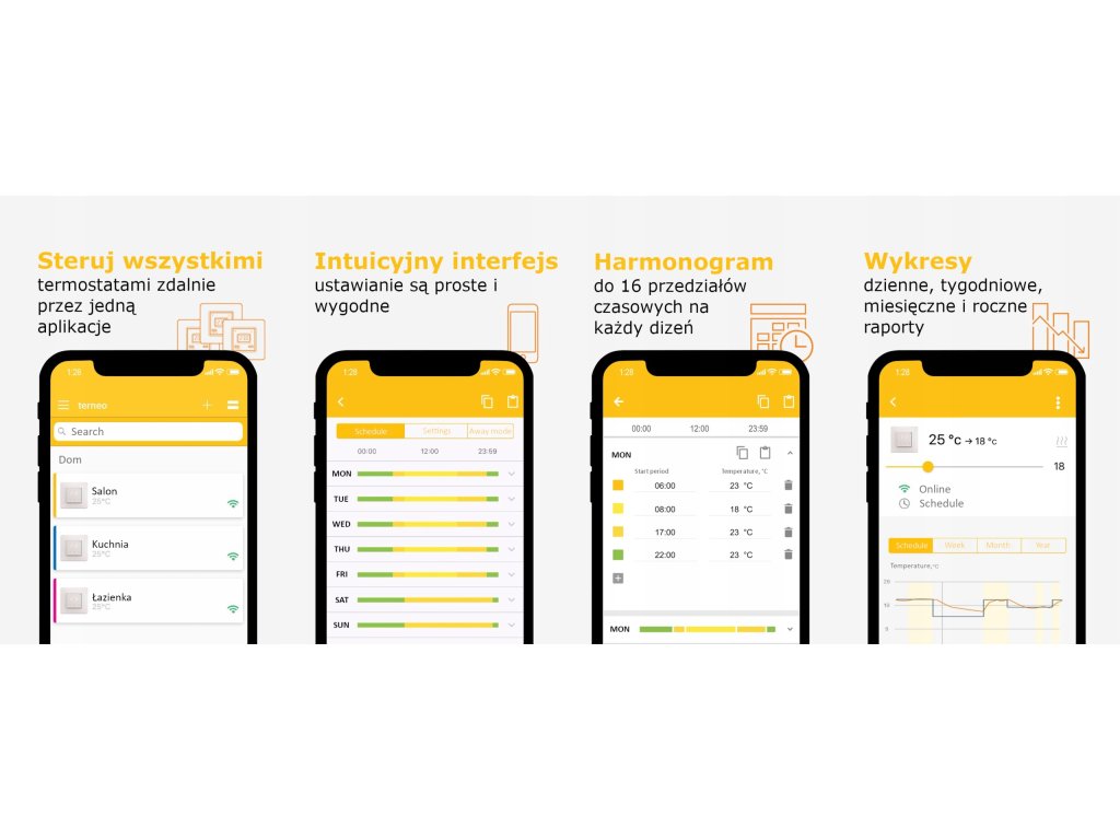 • Harmonogram: ustaw do 16 przedziałów czasowych na dobę, w każdym z nich termostat może podtrzymywać inną temperaturę.